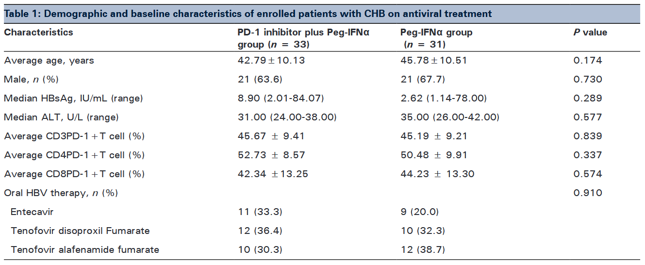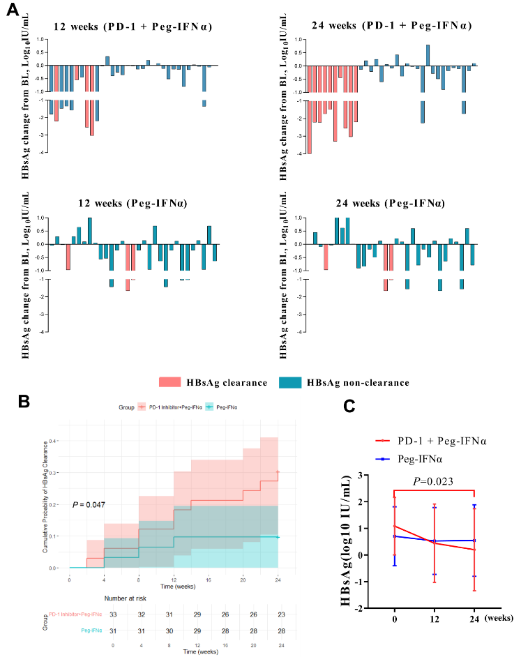 这是一项前瞻性的队列研究(ChiCTR2400091948),纳入64例HBeAg阴性且接受PEG IFNα治疗48周后未获得HBsAg清除,且外周血T细胞PD-1水平升高(CD3+PD-1+ > 40.82%,CD4+PD-1+ > 42.10%,或CD8+PD-1+ > 41%)的慢乙肝患者,根据治疗偏好分为治疗组[n = 33,PD-1抑制剂(1mg/kg Q12W) +PEG IFNα(180 μg/周)+ 核苷类似物(NAs)]和对照组(n = 31,继续PEG IFNα+ NAs治疗)。主要终点为24周HBsAg清除率,次要终点包括安全性、HBsAg动态变化及干扰素通路相关细胞因子水平。