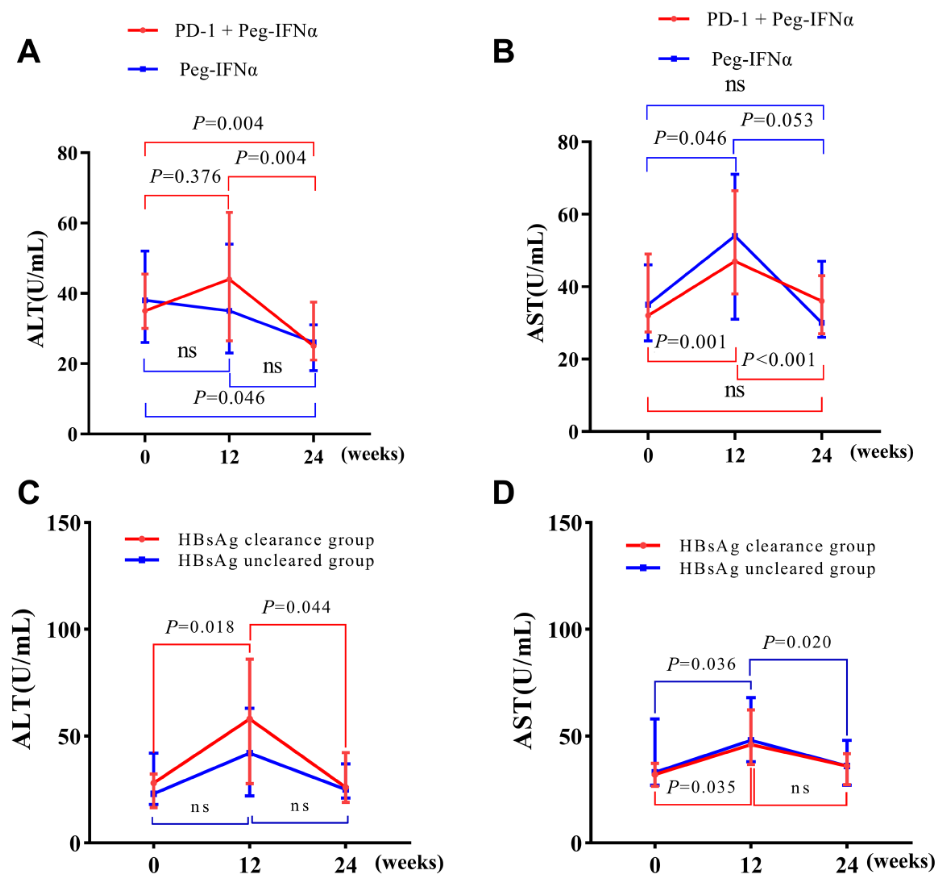 联合治疗组的ALT和AST水平在第12周时显著升高,第24周恢复至基线水平,对照组在治疗24周时出现ALT峰值,AST于第12周升高后第24周恢复正常。