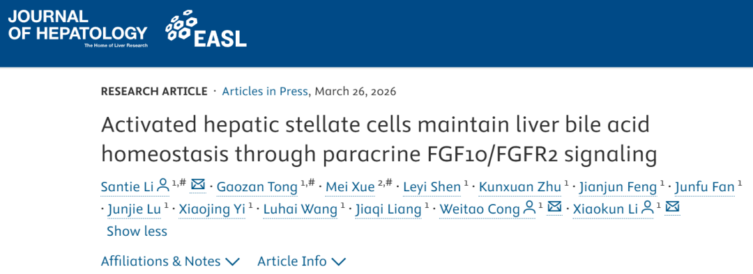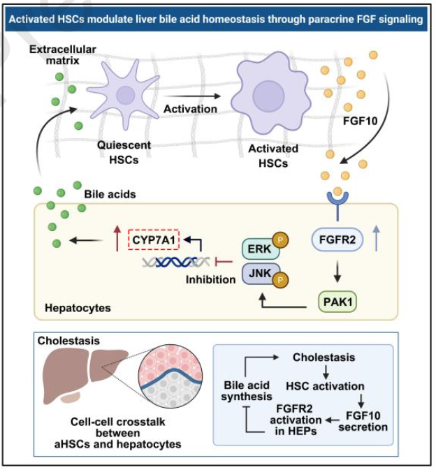 BAs由胆固醇合成,作为信号分子在整个肝肠循环中循环。在肝脏中,初级BAs,包括胆酸(CA)和鹅去氧胆酸(CDCA),通过肝细胞中的4个关键酶CYP7A1合成。成纤维细胞生长因子(FGF)信号5与肠肝系统中的BA代谢密切相关。肠细胞分泌的FGF15/19通过抑制CYP7A1产生BA合成的负反馈环。肝内自分泌FGF4/FGF受体4(FGFR4)信号也有助于通过下调CYP7A1和CYP8B1来调节BA体内平衡。有趣的是,HSCs介导的旁分泌 FGF/FGFR信号已被证明与肝脏发育和疾病进展有关,表明BA代谢的潜力。