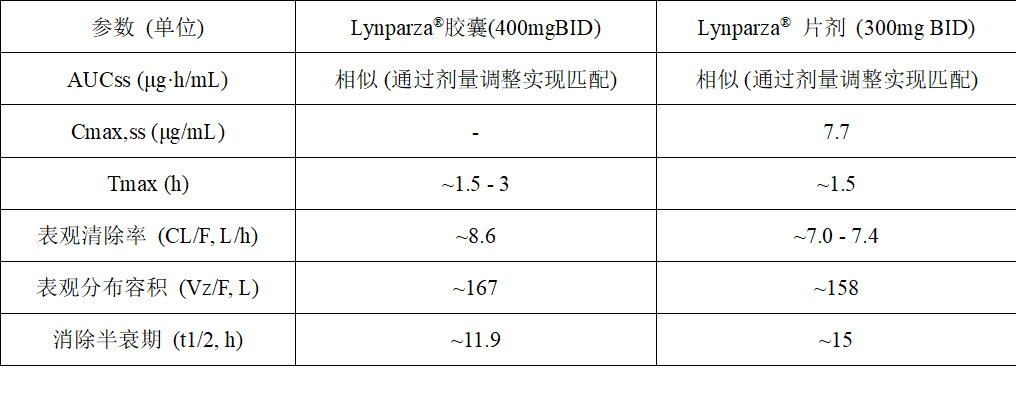 为解决胶囊剂的“药丸负担”问题并进一步优化药物的药代动力学特性,阿斯利康开发了新一代的Lynparza®片剂。该片剂于2017年获得FDA批准。变更的驱动因素与逻辑: 制剂变更的目标非常明确:显著降低药丸负担:这是最核心的驱动力。通过提高单片药物的载药量和生物利用度,减少每日服药的总片数。提高生物利用度并降低变异性:采用更先进的增溶技术,旨在比初代胶囊更有效地提高药物的溶出度和吸收,从而可能在更低的剂量下达到同等的治疗暴露,同时减少患者间的药代动力学差异。简化给药方案: 提升患者便利性,例如减少与食物同服的限制等。新制剂的特点与优势,片剂提供了100mg和150mg两种规格。新的推荐剂量调整为每次300mg(2片150mg),每日两次(BID)。这一变更使得患者的每日服药量从16粒胶囊锐减至4片药片,极大地改善了患者的用药体验和依从性。2.3两种剂型的药代动力学比较