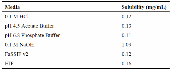 奥拉帕尼的理化性质是其制剂开发困难的直接原因,其中最突出的便是其极低的水溶性。溶解度(Solubility):奥拉帕尼是一种难溶性药物。其在生理pH范围(pH 1.2至6.8)的水性介质中,溶解度表现出pH不依赖性,数值极低,约为0.1 mg/mL。具体实验数据显示,其在pH 1.2盐酸介质中溶解度为0.10-0.12 mg/mL,在pH 4.5醋酸缓冲液中为0.13 mg/mL,在pH 6.8磷酸缓冲液中为0.11 mg/mL。尽管在生物相关模拟肠液(FeSSIF)中,其溶解度可略微提升至0.2 mg/mL,但这仍远低于高剂量给药所需的要求。相比之下,它在有机溶剂如DMSO(可达33 mg/mL)和乙醇(1.7 mg/mL)中溶解性更好。表1在37˚C下,奥拉帕尼在生理pH范围内的水溶性(参考1)酸碱性:奥拉帕尼被定性为弱酸性化合物。其在胃肠道环境中,奥拉帕尼分子几乎完全以非解离的中性形式存在,其溶解度基本不随pH变化而改变。亲脂性(Lipophilicity):奥拉帕尼具有中等亲脂性。实验测定的其在pH 7.4下的辛醇/水分配系数(Log D)为1.49。这一特性虽然有助于药物分子穿透细胞膜,但与其极低的水溶性相结合,使得药物难以从制剂中溶出并到达肠壁表面以供吸收。熔点:奥拉帕尼为结晶性粉末,属于难溶性药物。通过差示扫描量热法测定,其熔点(定义为起始温度)为199-206°C。奥拉帕尼为非手性分子。1.3生物药剂学分类(BCS):确认为IV类药物