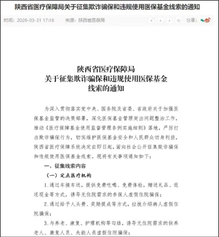 陕西省、云南省、海南省和宁夏回族自治区医保局亦于近期发布公告,面向全社会公开征集相关问题线索。