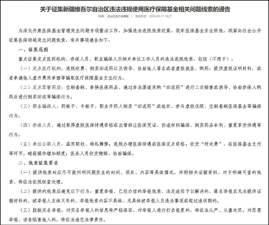 同时,新疆也征集单位公职人员滥用职权、徇私舞弊,违规办理医保待遇或医保定点资格,收受“好处费”以在医保基金支付等环节暗箱操作,医务人员收受贿赂、协助骗保等线索。