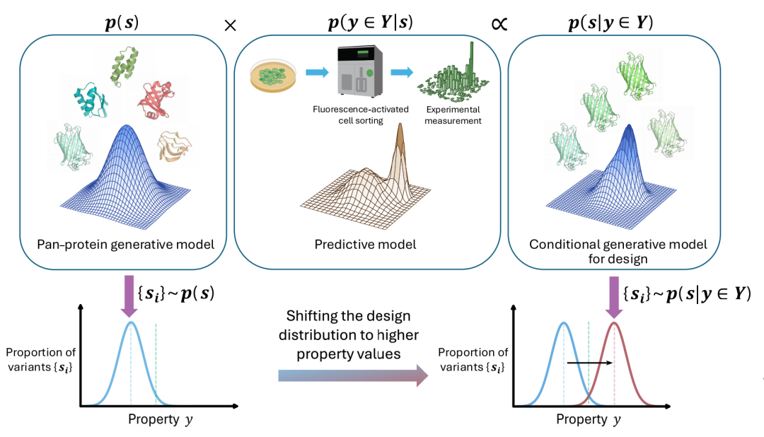 AI 蛋白质设计的终极目标,就是计算出“在给定一系列设计条件(Y)下,一个蛋白质序列(s)出现的概率分布”——即 p(s | y∈Y)。 然后,从这个概率分布中采样,就能直接得到符合要求的候选蛋白序列。这就像在“天书”上施加了一个精确的“过滤咒”和“引导术”。