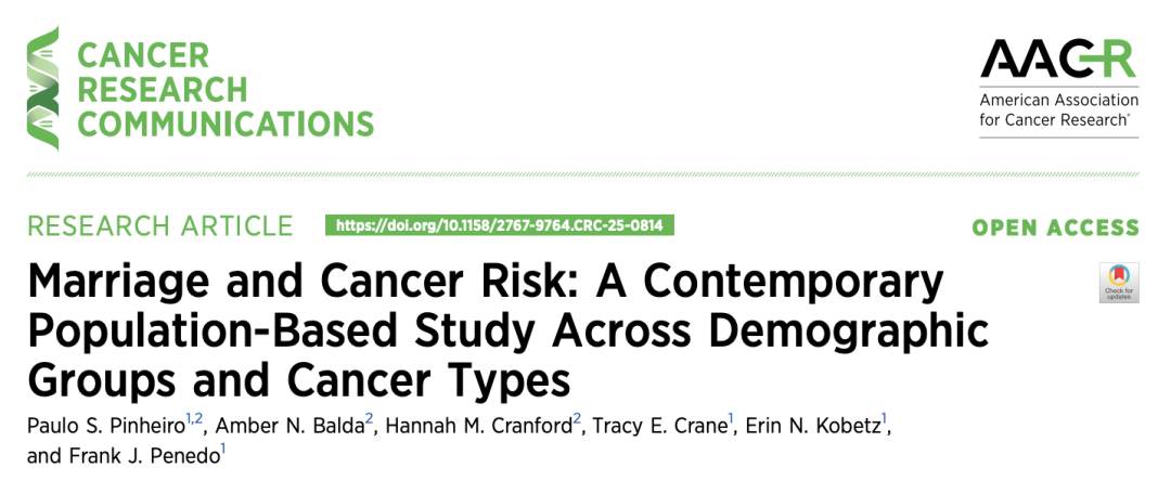 近日,迈阿密大学的研究人员在 Cancer Research Communications 期刊发表了题为:Marriage and Cancer Risk: A Contemporary Population-Based Study Across Demographic Groups and Cancer Types 的研究论文。