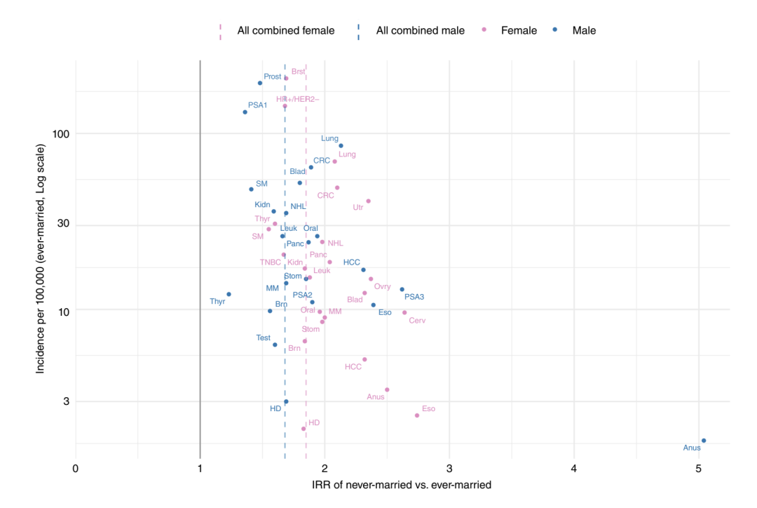 然而,婚姻带来的健康益处并非平均分配,例如,男性往往从婚姻带来的健康和社会优势中获益更多,而女性从中获得的影响则更为多变。在肿瘤学领域,之前关于婚姻状况的研究几乎完全集中在诊断后的结局上——已婚的癌症患者更有可能在早期被诊断,并且与未婚个体相比生存率更高。但这些优势是否延伸到癌症发病风险本身?这个问题一直缺乏深入研究。