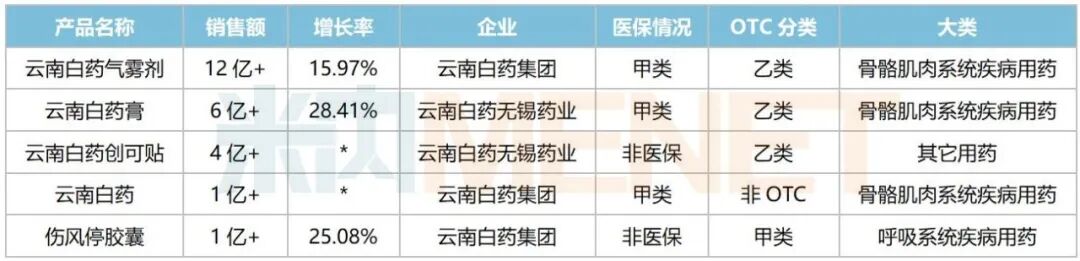 2025年云南白药在中国零售药店终端销售过亿的独家中成药