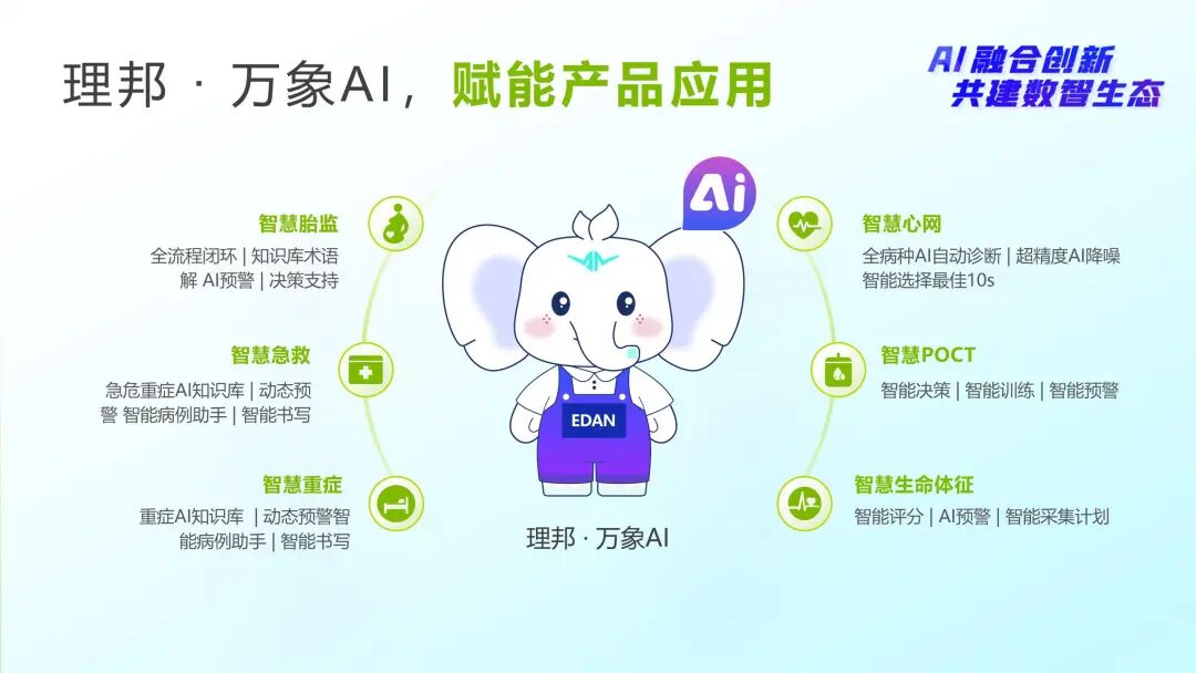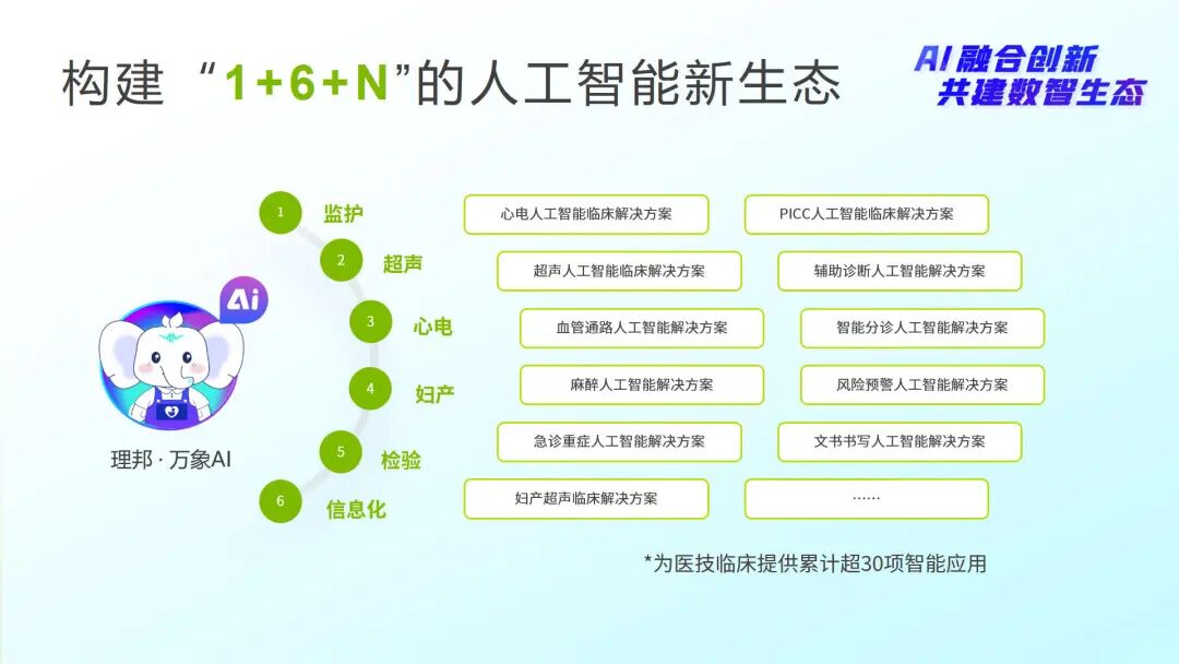 基于30余年海量临床数据与技术优势,理邦以万象AI为核心根基,深度融合理邦6大垂域,为医技与临床智能化应用提供N种可能,持续扩容“1+6+N”人工智能新生态,推动全域智能的智慧医疗生态建设。
