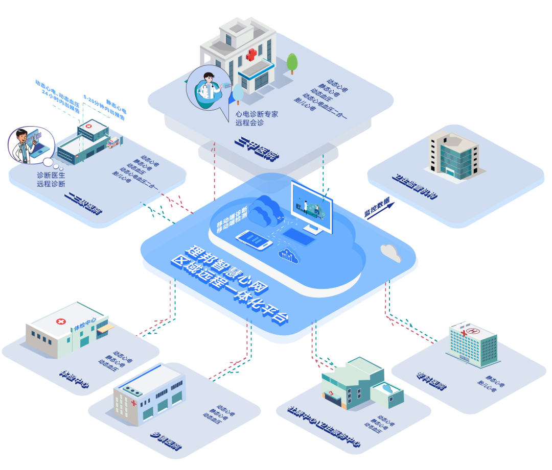 依托在医疗信息化与智能硬件领域的深厚积累,理邦智慧心网以“万象AI+智能硬件+多网合一”为核心,围绕患者全流程诊疗需求,构建覆盖院内外、贯通区域与全国的心电应用全场景,为解决区域心电网络建设设备接口不统一、数据标准缺失、AI辅助诊断能力弱提供了全面解决方案。