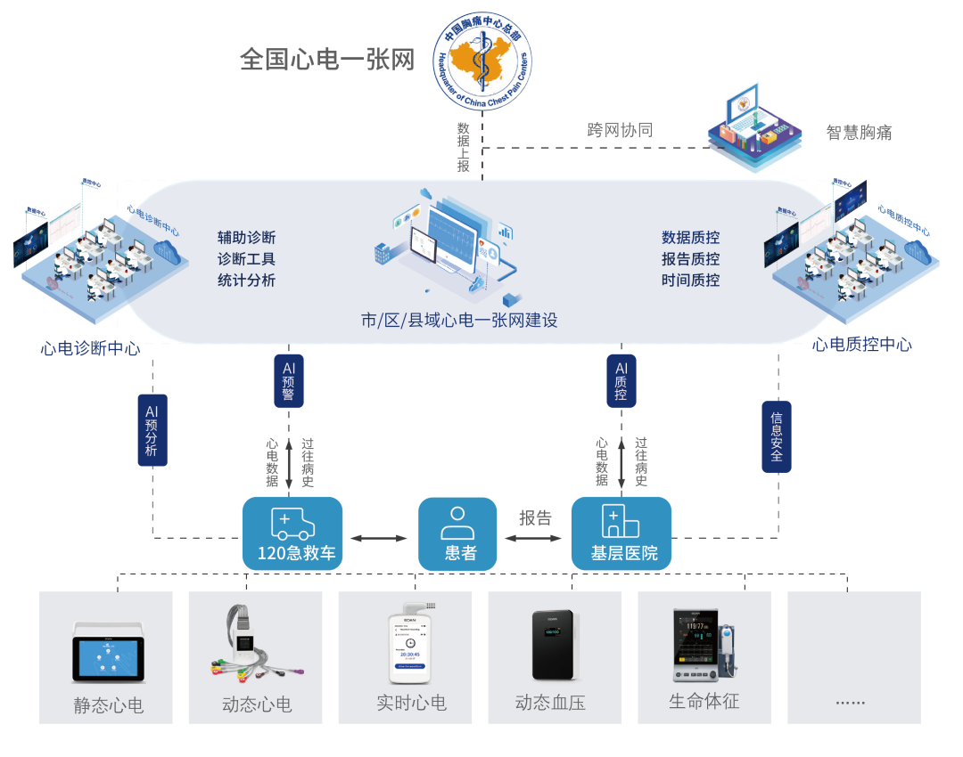 支持院内心电网络、区域远程心电网络、全国心电一张网;实现智慧急救与智慧心网跨网联网,数据共享。