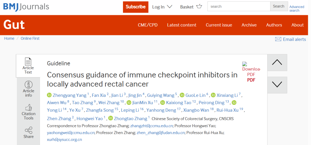 编者按:2026年3月,由首都医科大学附属北京友谊医院张忠涛教授/姚宏伟教授联合复旦大学附属肿瘤医院章真教授、中山大学肿瘤防治中心徐瑞华院士等国内专家,携手中华医学会外科学分会结直肠外科学组共同制定的《局部进展期直肠癌免疫检查点抑制剂应用国际指南》(以下简称“指南”)正式发表于国际消化病学期刊《Gut》。
