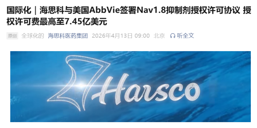 2026年4月,海思科与全球制药巨头艾伯维(AbbVie)达成独家许可协议,将其Nav1.8抑制剂项目(HSK55718注射液、HSK51155口服药)在除中国大陆、香港特别行政区及澳门特别行政区以外的全球范围内开发、生产和商业化的独家权利有偿许可给AbbVie。海思科将获得项目授权许可费(3,000万美元的首付款及最高7.15亿美元的额外里程碑付款)和特许权使用费。AbbVie还将支持授权品种Nav1.8抑制剂在合作项下开发至临床概念验证的一定的研发成本。