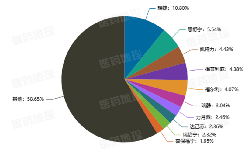PDB药物综合数据库显示,思舒宁在2025年国内麻醉镇痛类药物占据5.54%的市场份额,仅次于宜昌人福药业的瑞捷(10.8%)。