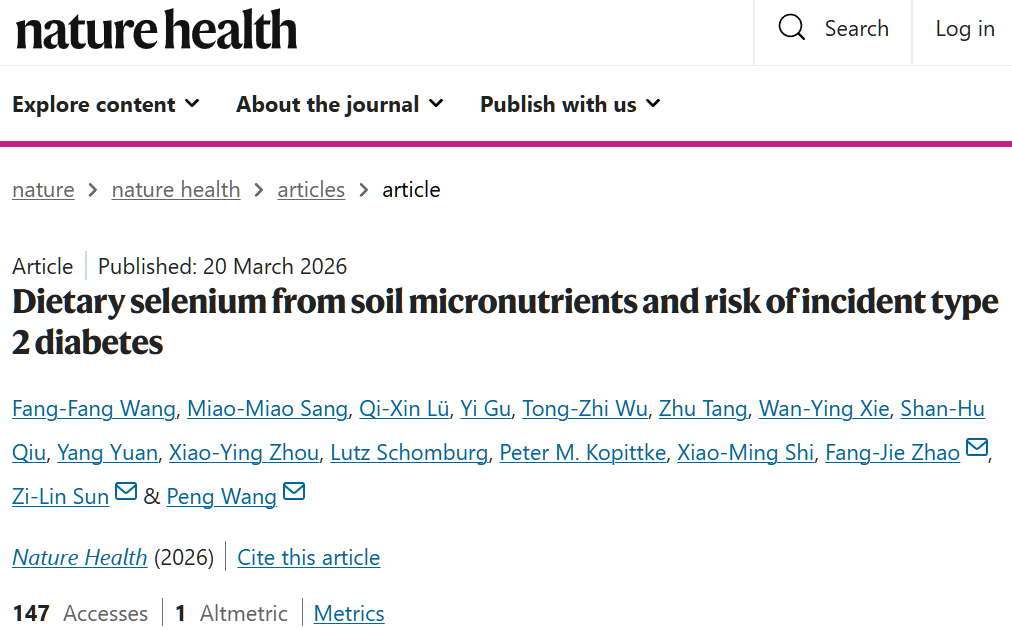 [1]Wang, FF., Sang, MM., Lü, QX. et al. Dietary selenium from soil micronutrients and risk of incident type 2 diabetes. Nat. Health (2026).