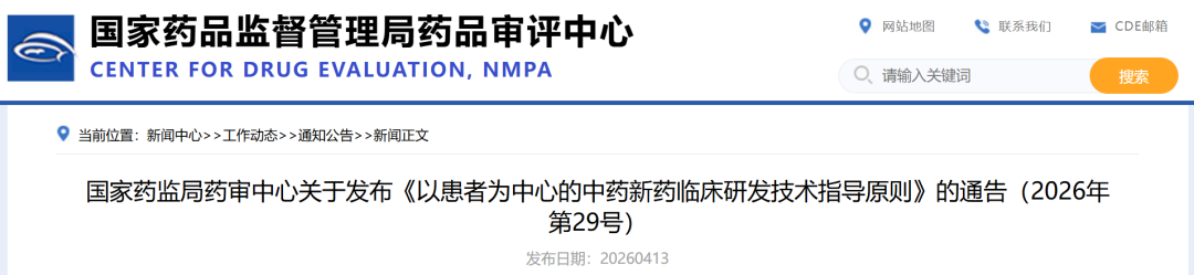 CDE发布《以患者为中心的中药新药临床研发技术指导原则》