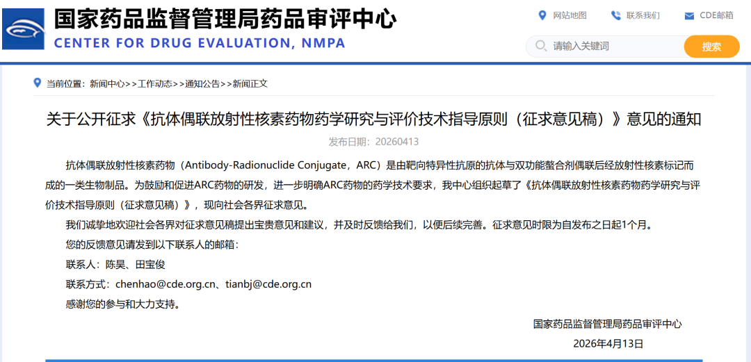 最新!CDE发布《抗体偶联放射性核素药物药学研究与评价技术指导原则(征求意见稿)》