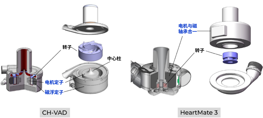 从轴承类型来看,旋转式人工心脏主要分为三种。较早的接触轴承式,转子依靠机械轴承支撑,代表产品是雅培的HeartMate Ⅱ;另一种采用液力悬浮技术来支承转子,以美敦力HVAD为代表;而仅靠磁力实现转子悬浮的全磁悬浮技术,代表产品则包括雅培的HeartMate 3,以及同心医疗在中美两地的产品CH‑VAD和BrioVAD。
