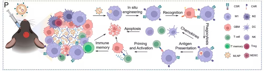 经改造的巨噬细胞保持了促炎状态,并表现出更强的吞噬活性,从而能够快速、高效地清除表达白细胞介素13受体α2亚基(IL13Rα2)的肿瘤细胞。此外,一种用于重编程胶质瘤切除腔周围巨噬细胞的可注射纳米颗粒-水凝胶系统,能够启动局部抗肿瘤免疫应答,并引发强大的长期免疫记忆,在术后GBM模型中抑制了肿瘤复发。