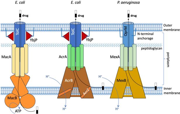 (MexAB-OprM; right). In gram-negative bacteria, the membrane is formed of an inner membrane (bottom), an outer membrane (top), and a layer of peptidoglycan in the space between these two membranes (which is called the periplasm). In MacAB-TolC, the MacB proteins embedded in the inner membrane rely on ATP as a source of energy. In both AcrABZ-TolC and MexAB-OprM, the proteins embedded in the inner membrane rely on the proton motive force for energy. In MexAB-OprM, the OprM protein is anchored in the outer membrane (top) by an N-terminal extension (blue line), but the TolC protein in the