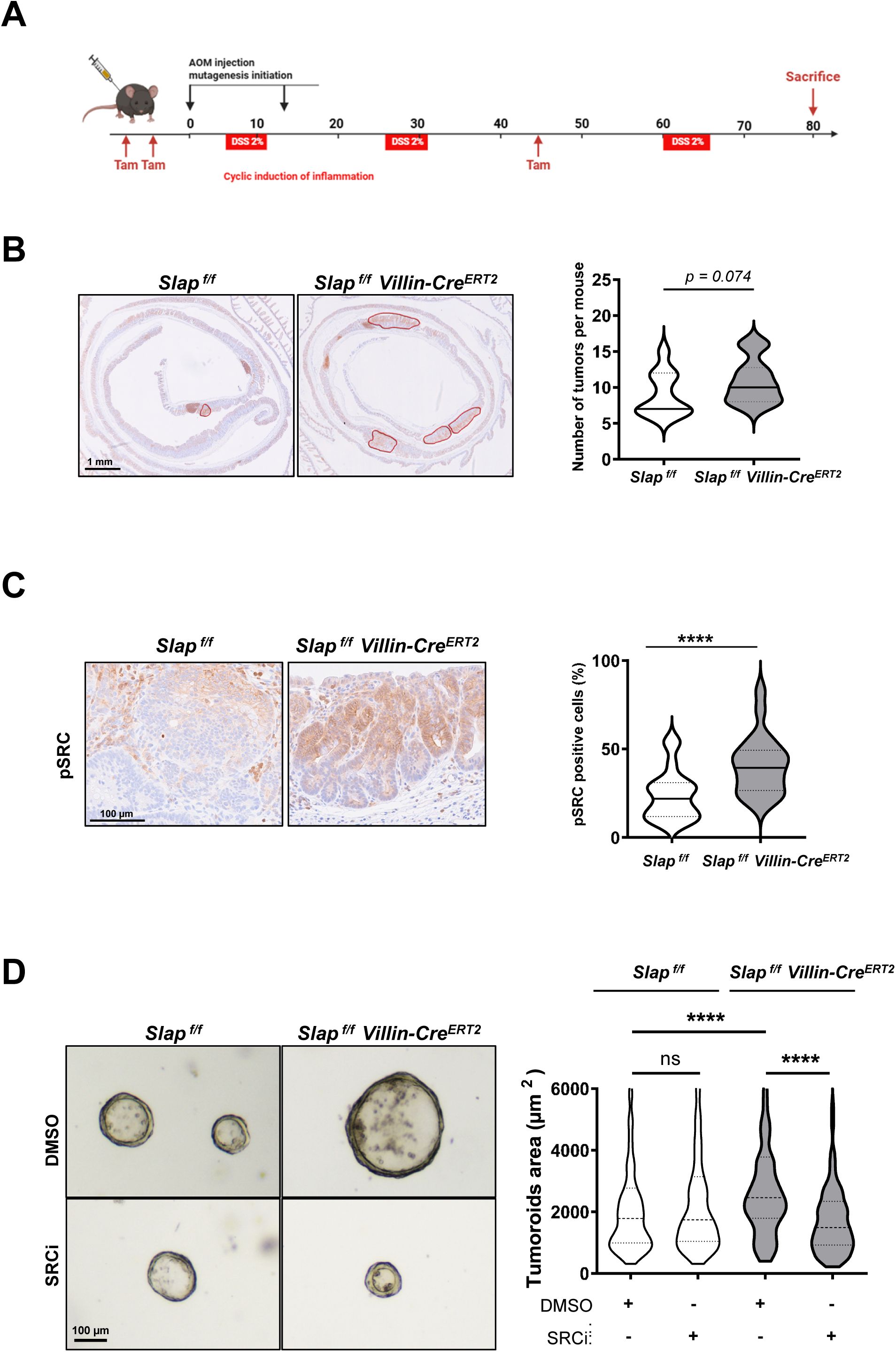 Inducible epithelial SLAP knockout mouse model was treated with tamoxifen to induce Slap depletion. DSS and AOM/DSS treatment was performed essentially as described in (