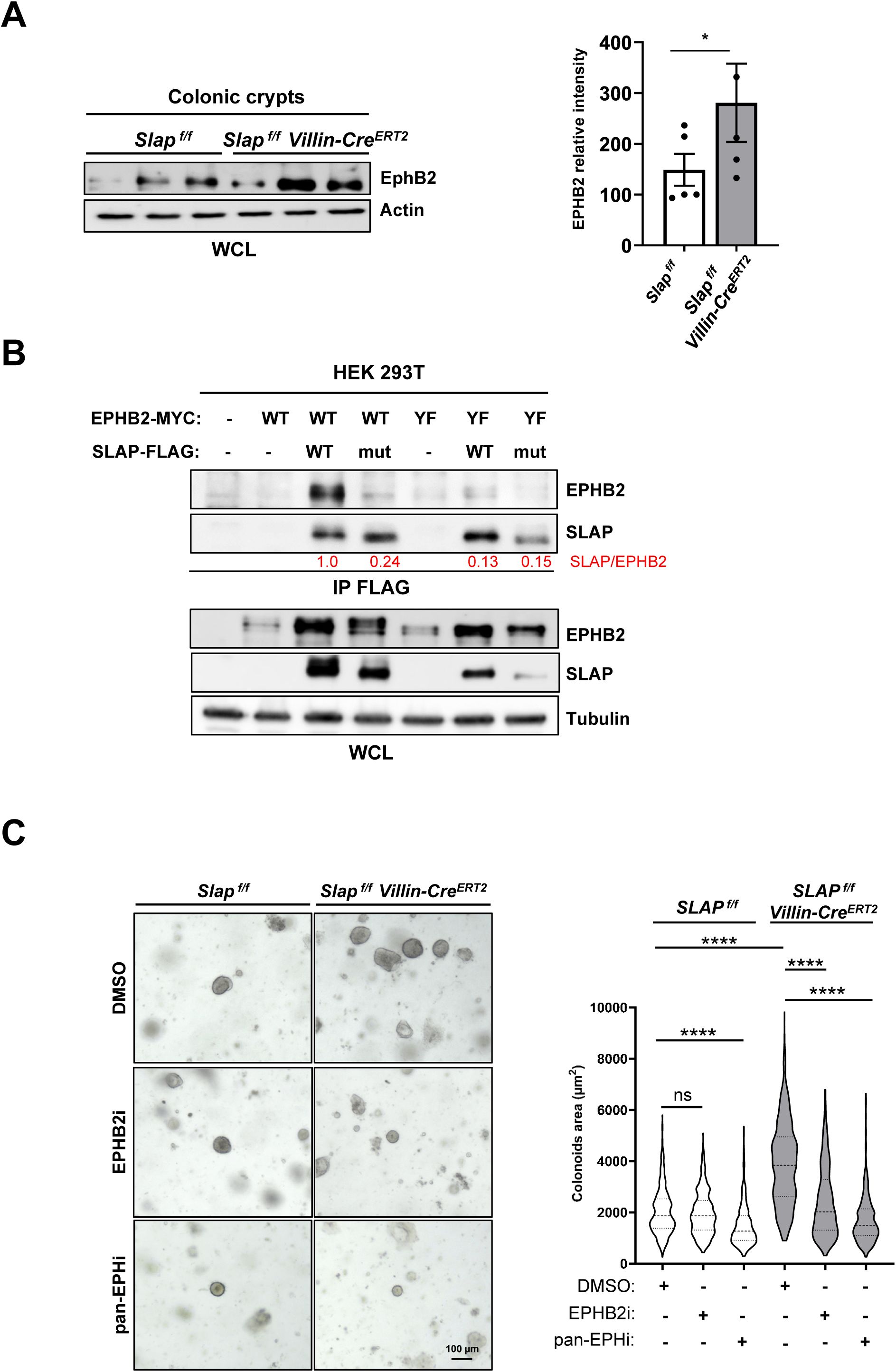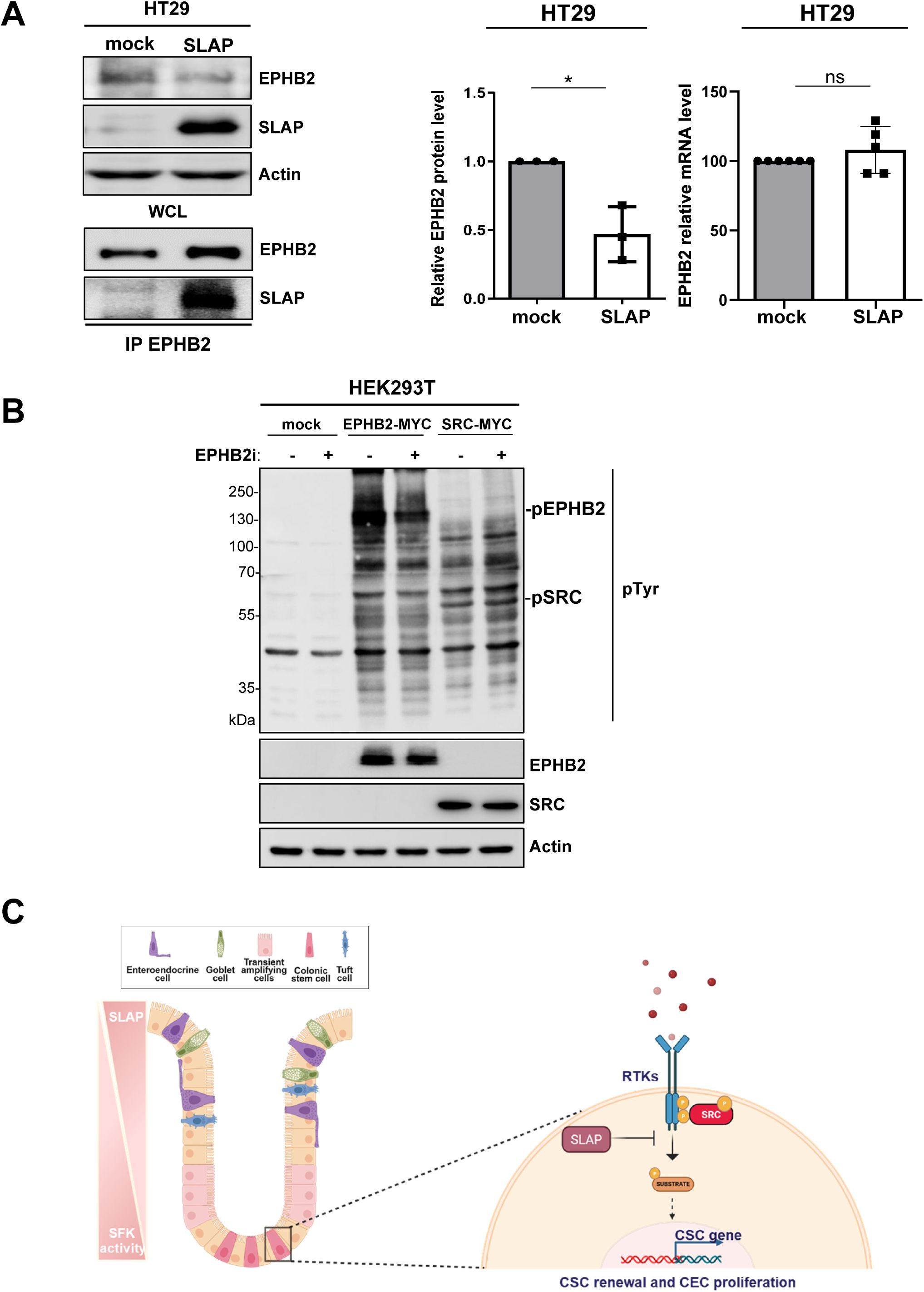 ). Notably, SLAP was found to be abundantly expressed in the intestinal epithelium. SLAP levels were reduced in 50% of CRC samples analysed, and SLAP silencing in experimental CRC models promoted tumour formation and liver metastasis. Mechanistically, SLAP promotes degradation of SRC signalling RTK EPHA2 (