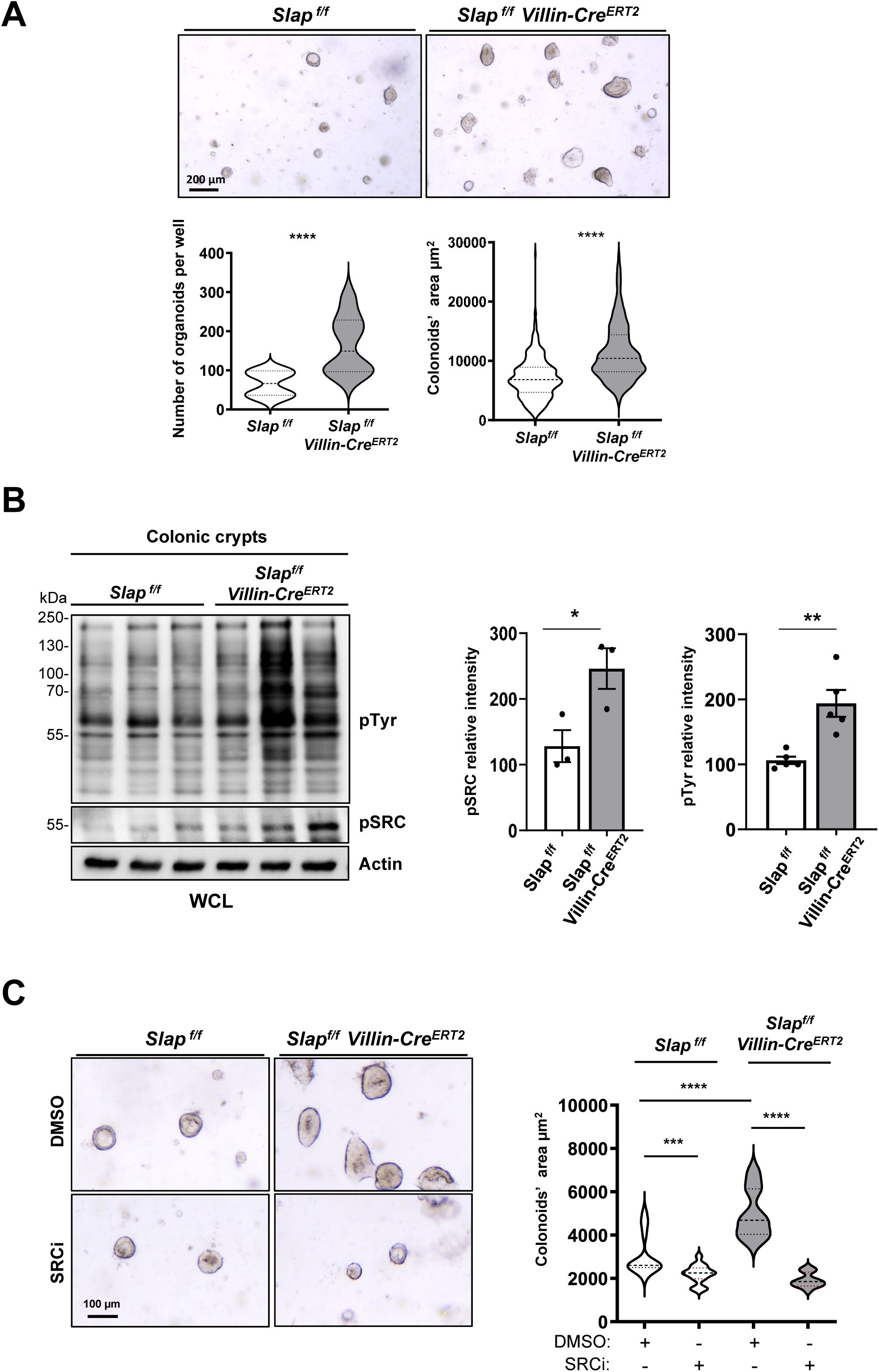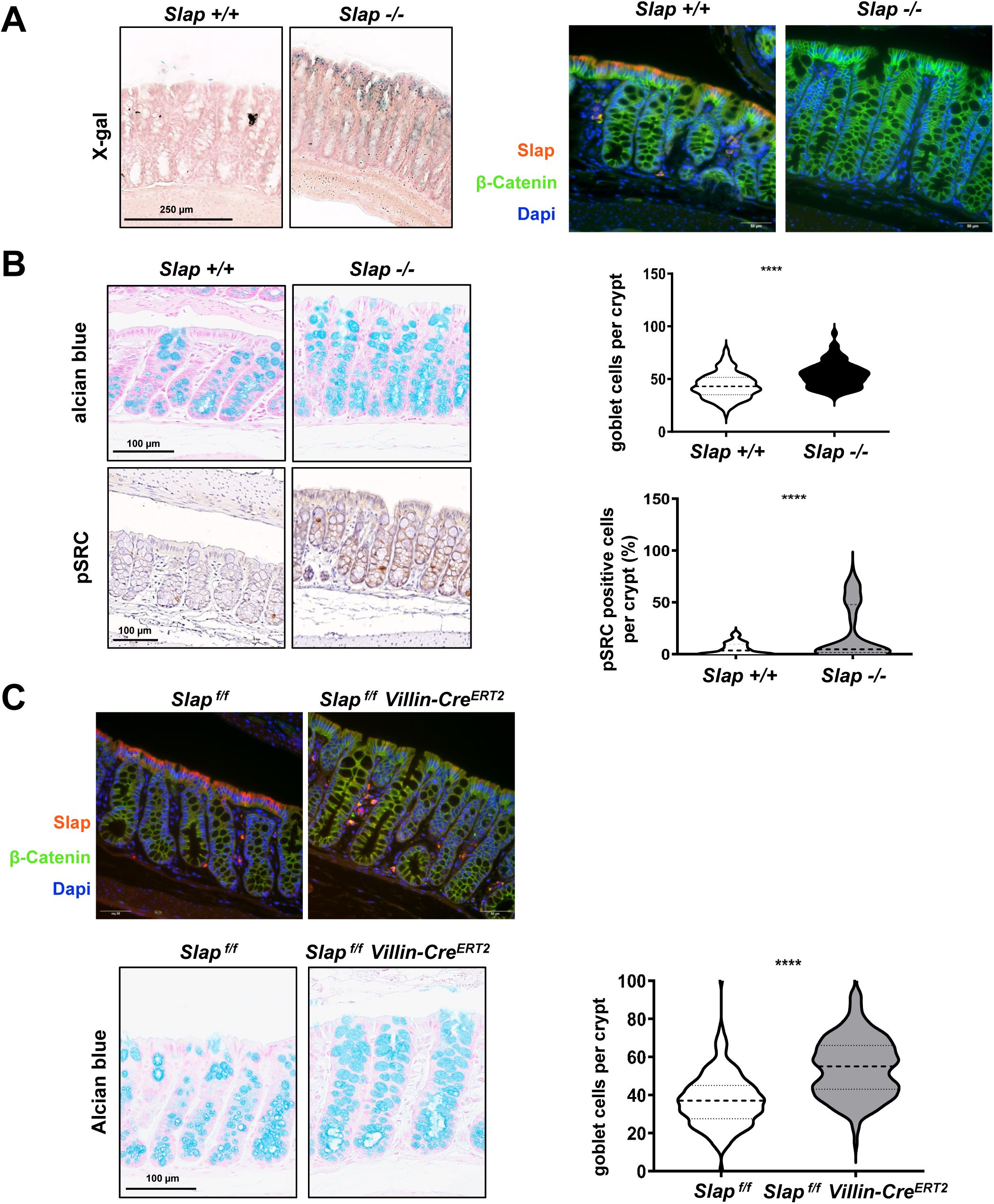 ). Although this observation suggests an important mechanism in the control of SRC function in the colon, genetic evidence for this mechanism is lacking. Here, we developed Slap-deficient mice models showing that Slap regulates SFK colonic epithelial function during homeostasis and tumorigenesis.