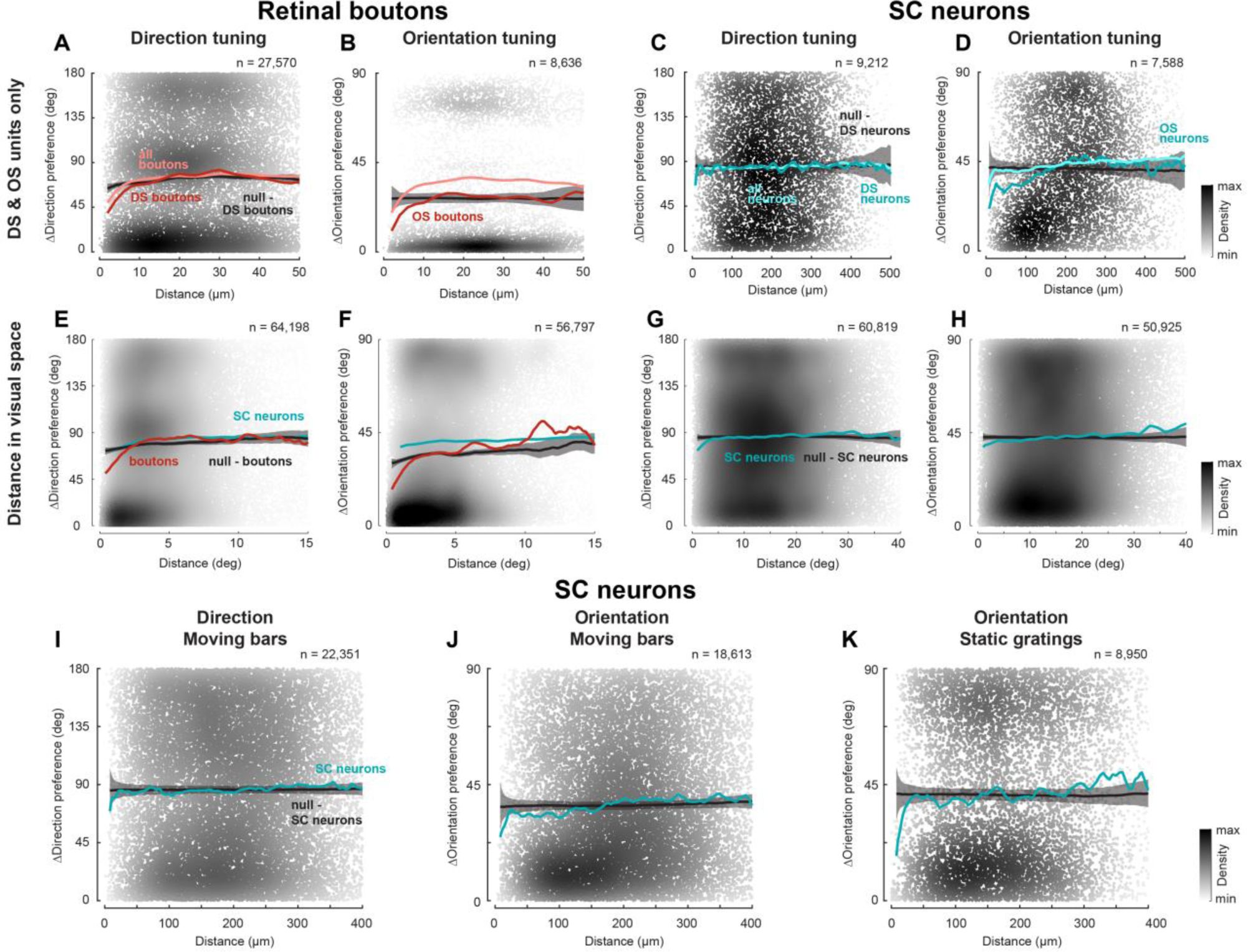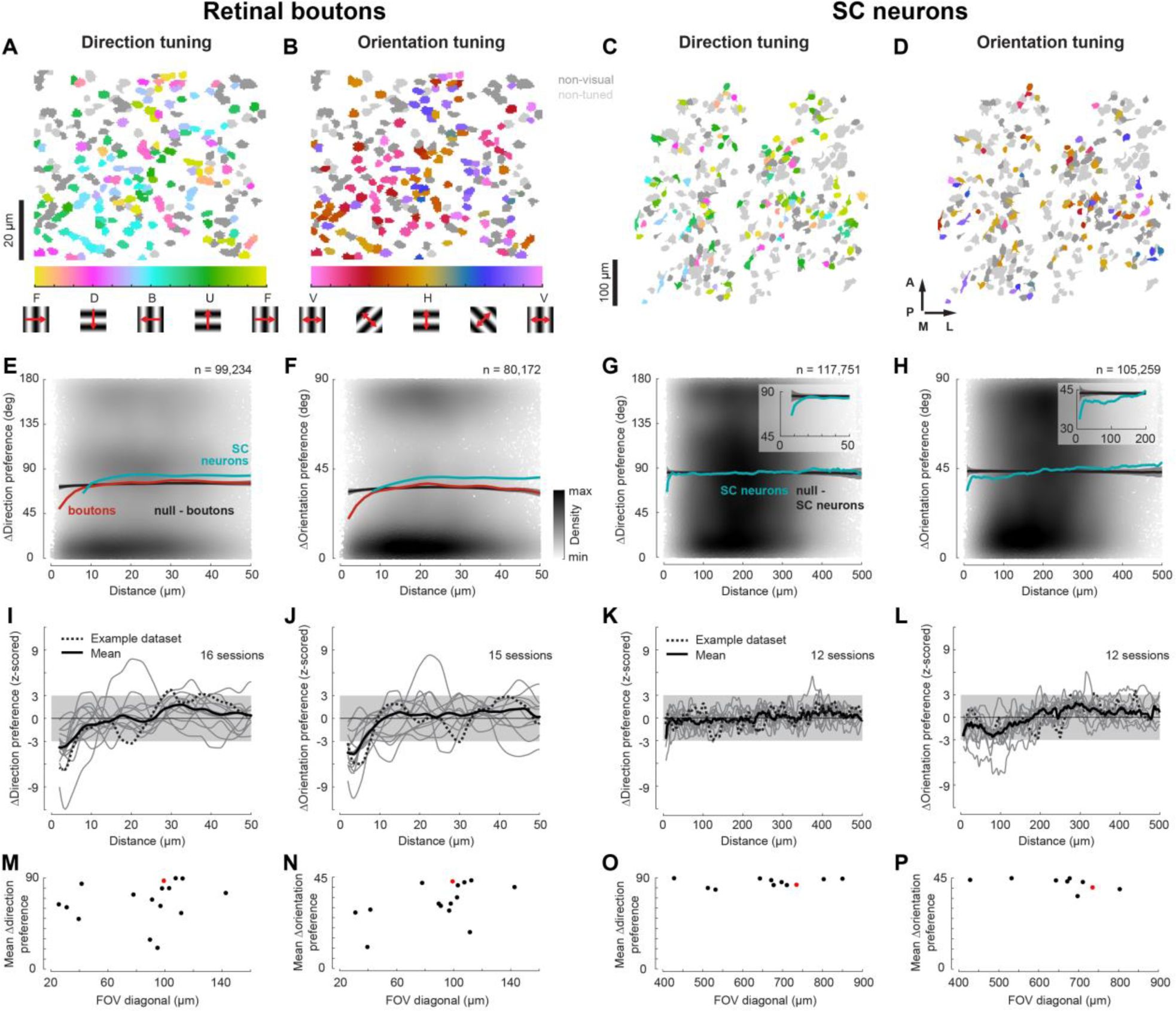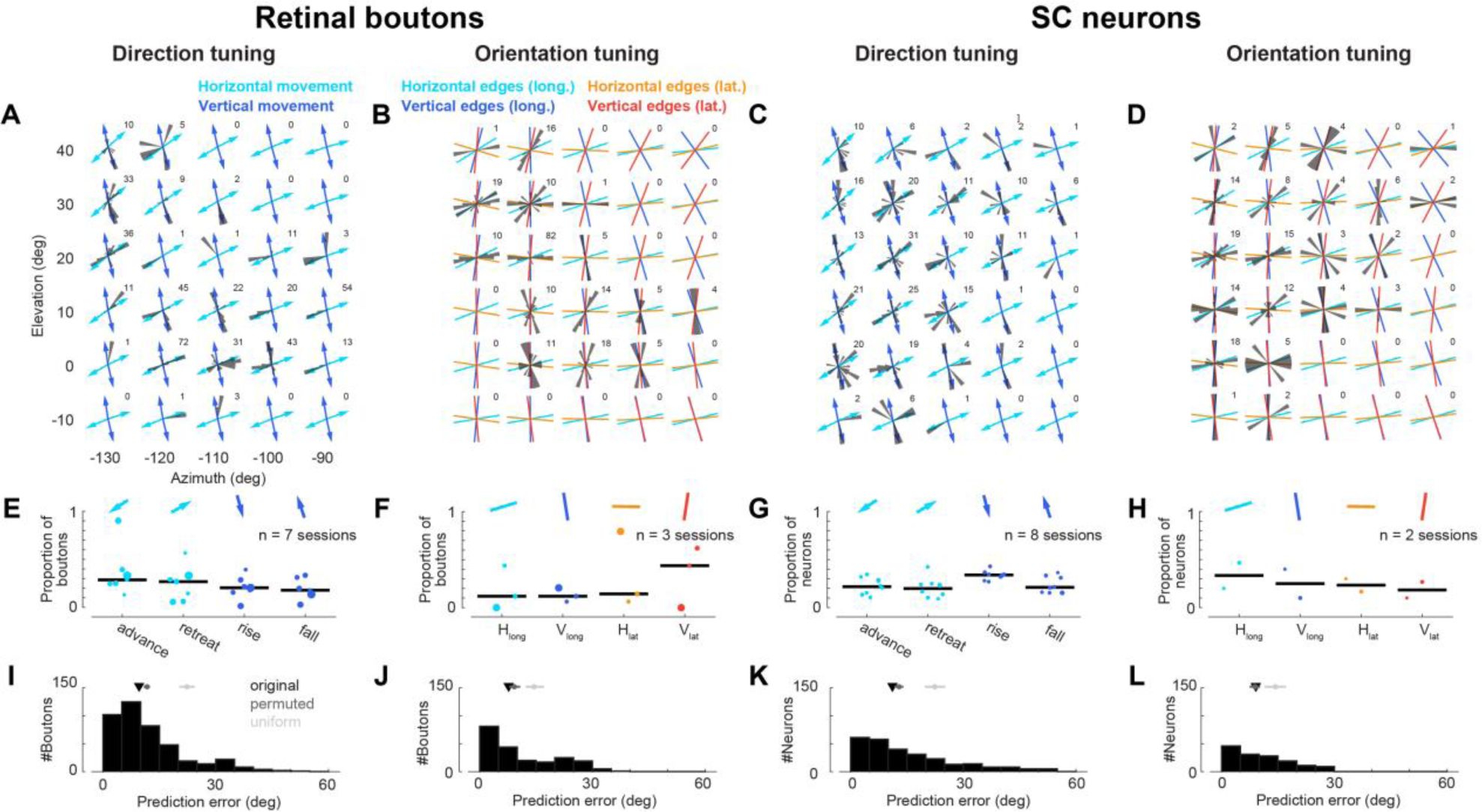 ). Across both retinal boutons and SC neurons, preferred directions and orientations spanned the full range, but were overrepresented near cardinal angles (0°, 90°, 180°, 270°;