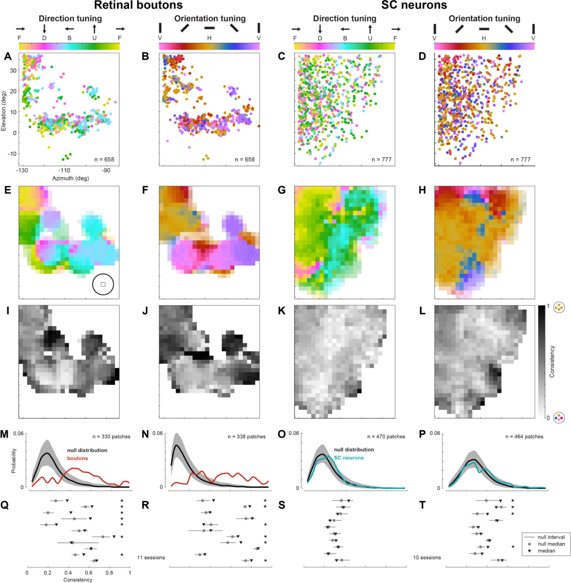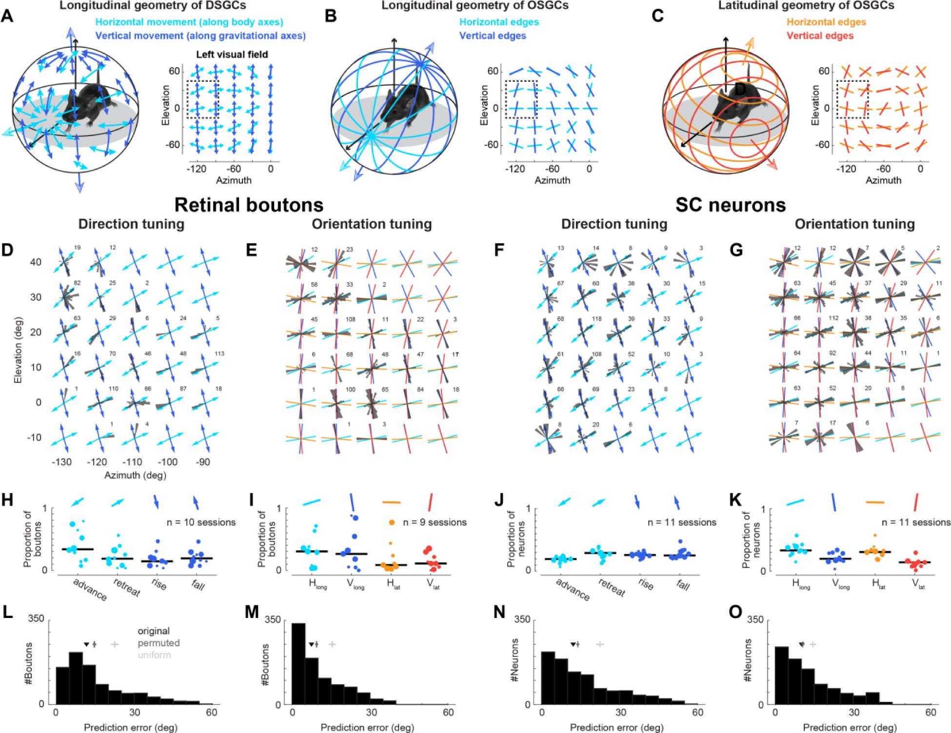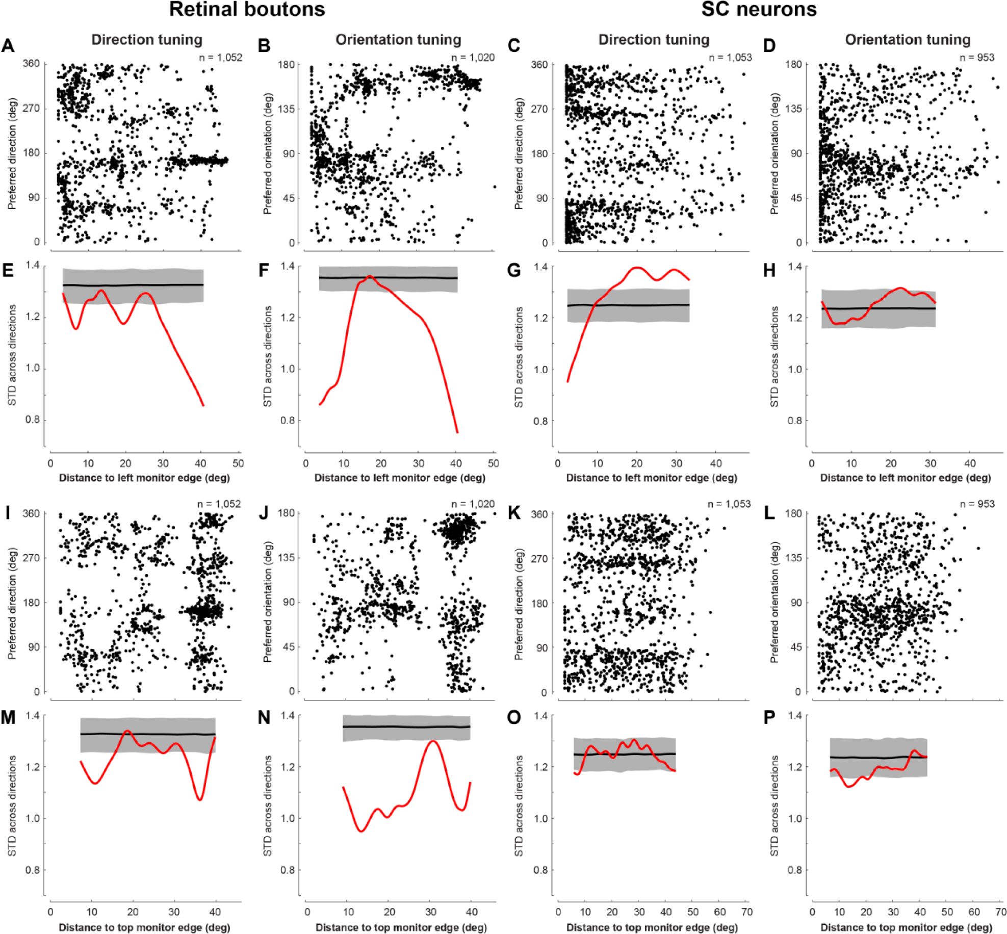 ). Across both retinal boutons and SC neurons, preferred directions and orientations spanned the full range, but were overrepresented near cardinal angles (0°, 90°, 180°, 270°;
