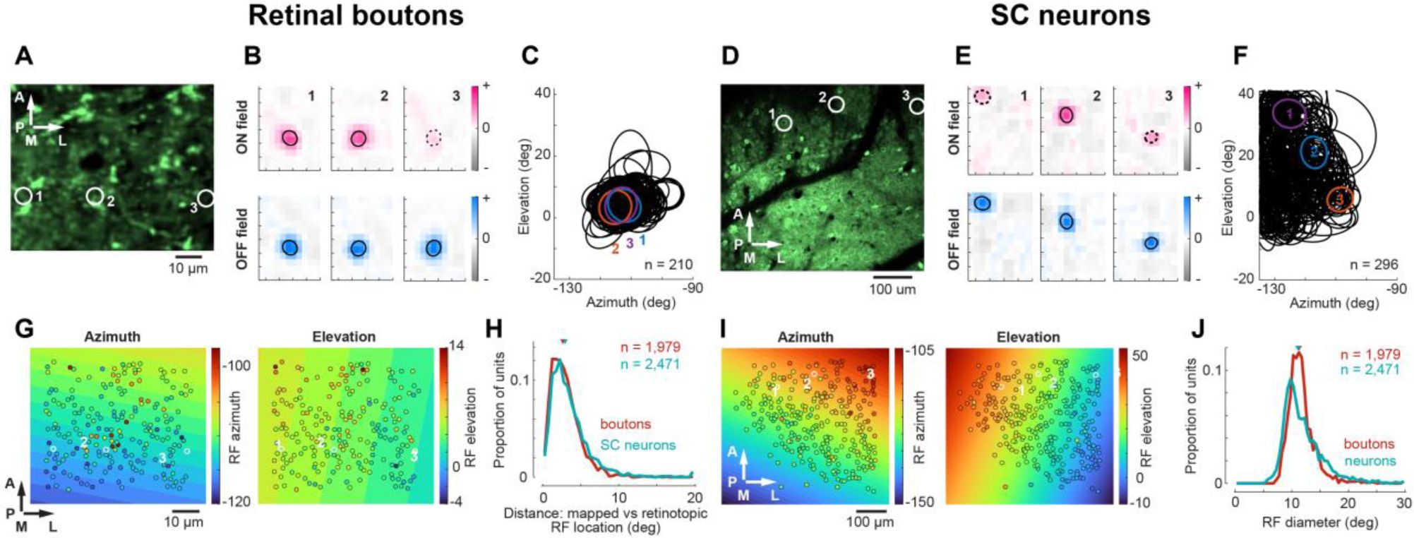 To compare the functional organization in retinal inputs and SC neurons, we imaged calcium signals in synaptic boutons of RGC axons and in neurons in the posterior right SC. In one group of mice, we expressed a synaptically targeted calcium indicator (