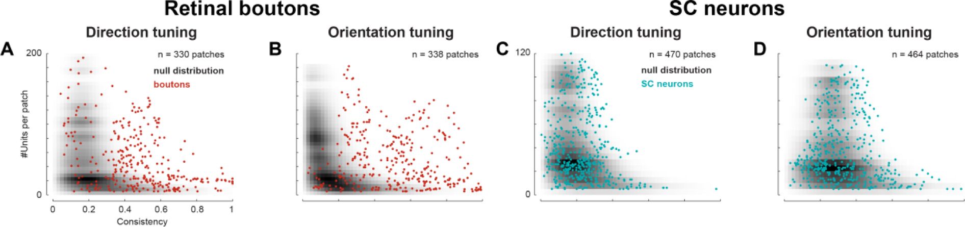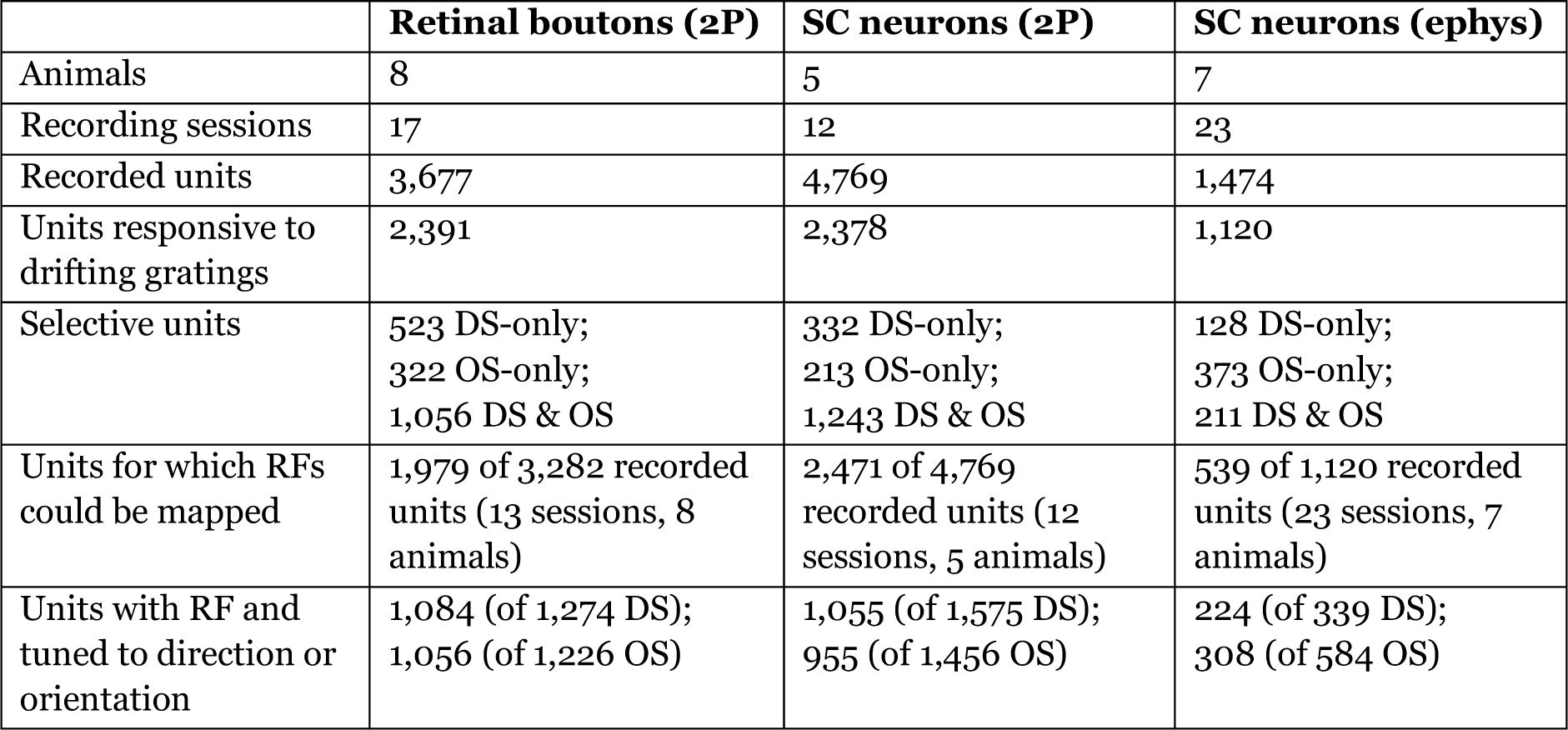 Retinal boutons and SC neurons were frequently selective to direction or orientation and exhibited a shared bias toward cardinal axes. Among responsive boutons, 23% were direction-selective (DS) only, 13% orientation-selective (OS) only, 44% selective to both features, and 20% non-selective (