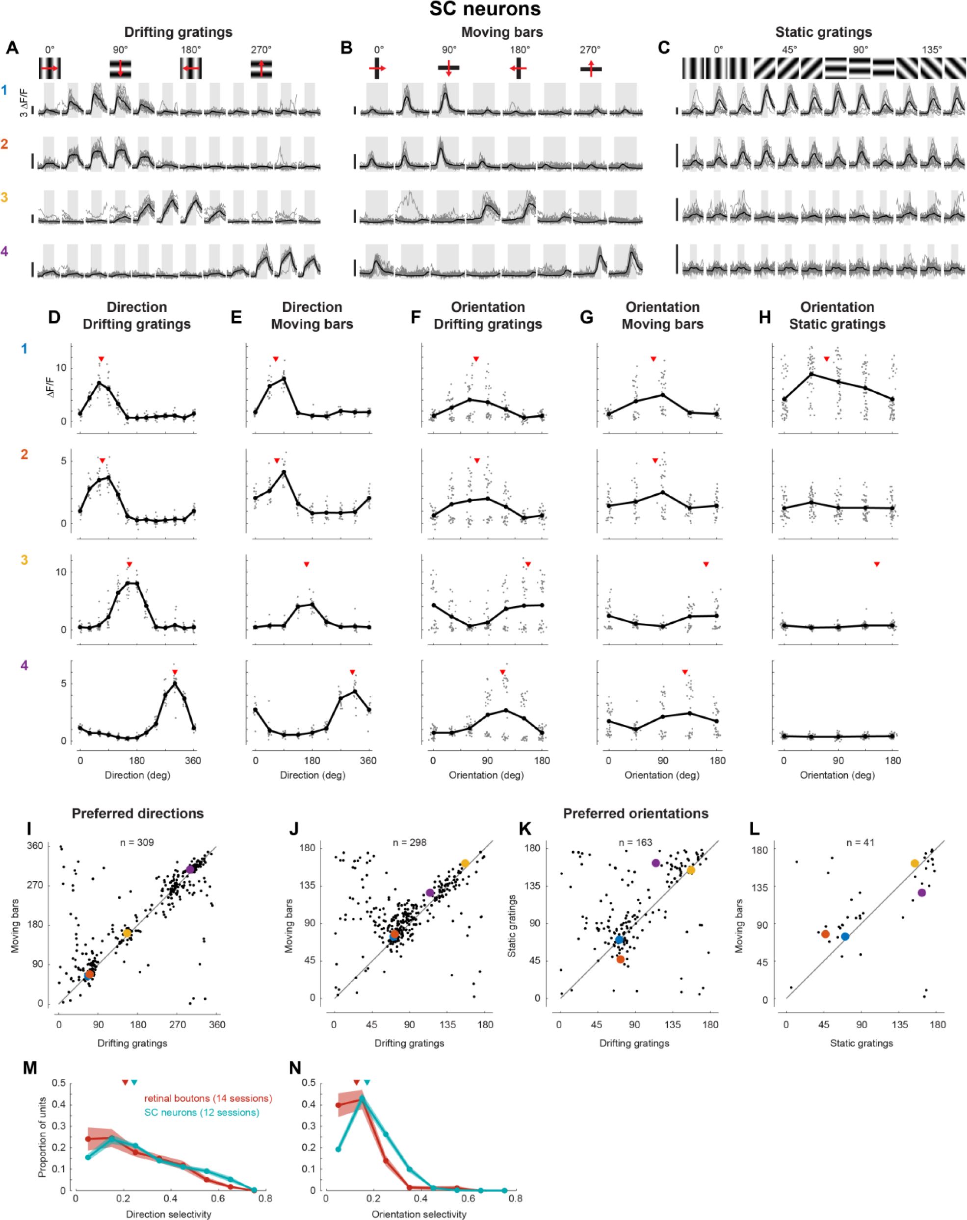 ). In a subset of SC neurons, we also presented moving bars and static gratings and found that preferred directions and orientations were highly consistent, confirming that tuning was largely invariant to stimulus class (