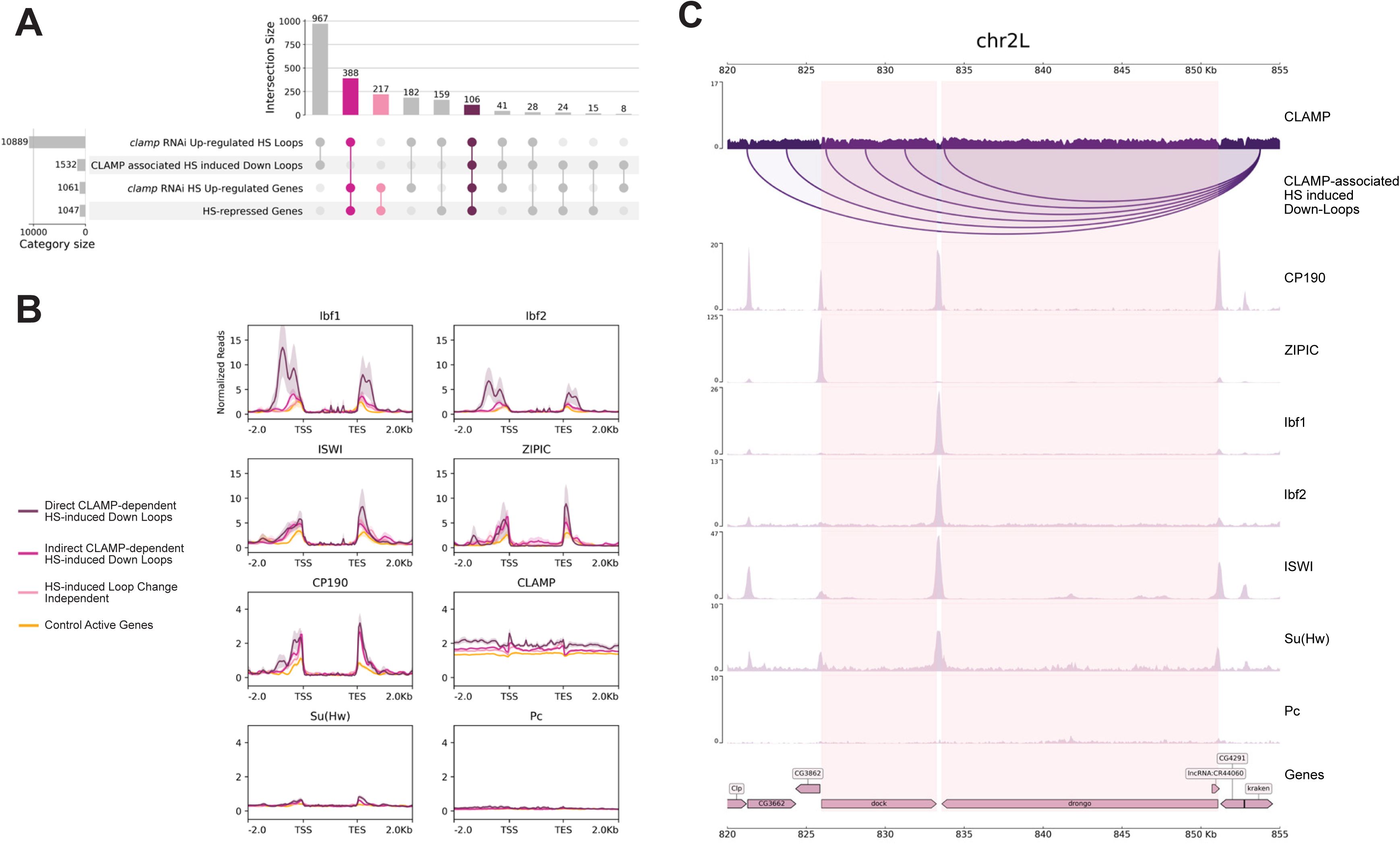 Furthermore, we demonstrate that heat stress induces global changes in local 3D chromatin organization at chromatin loop anchors. We found that CLAMP inhibits the formation of 3D chromatin loops during heat stress when it is directly bound to loop anchors, but its occupancy at these anchors does not change. In addition, we compared the occupancy of different insulator proteins and chromatin remodelers at CLAMP-dependent HS-repressed genes prior to heat stress. We found that CLAMP