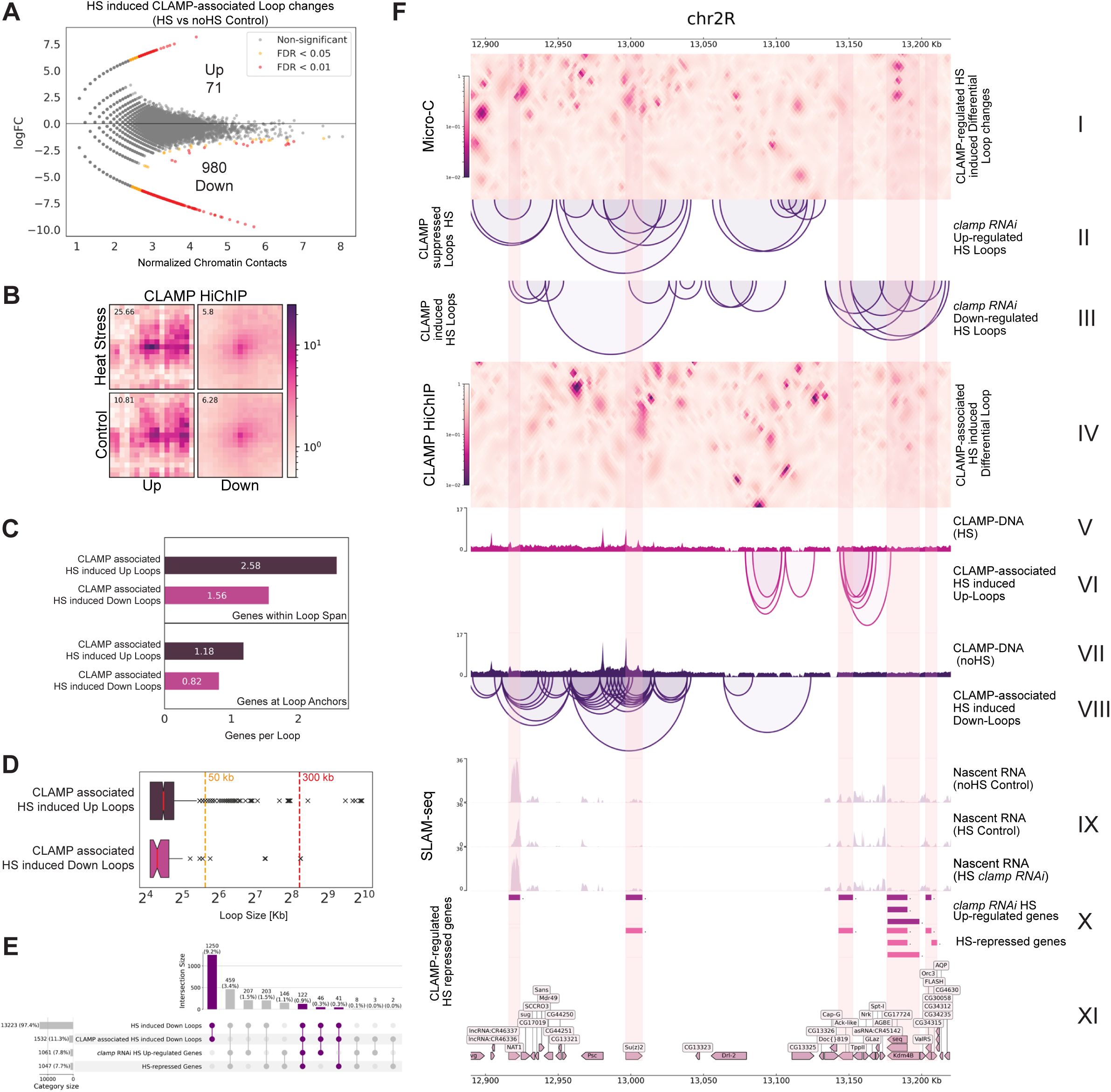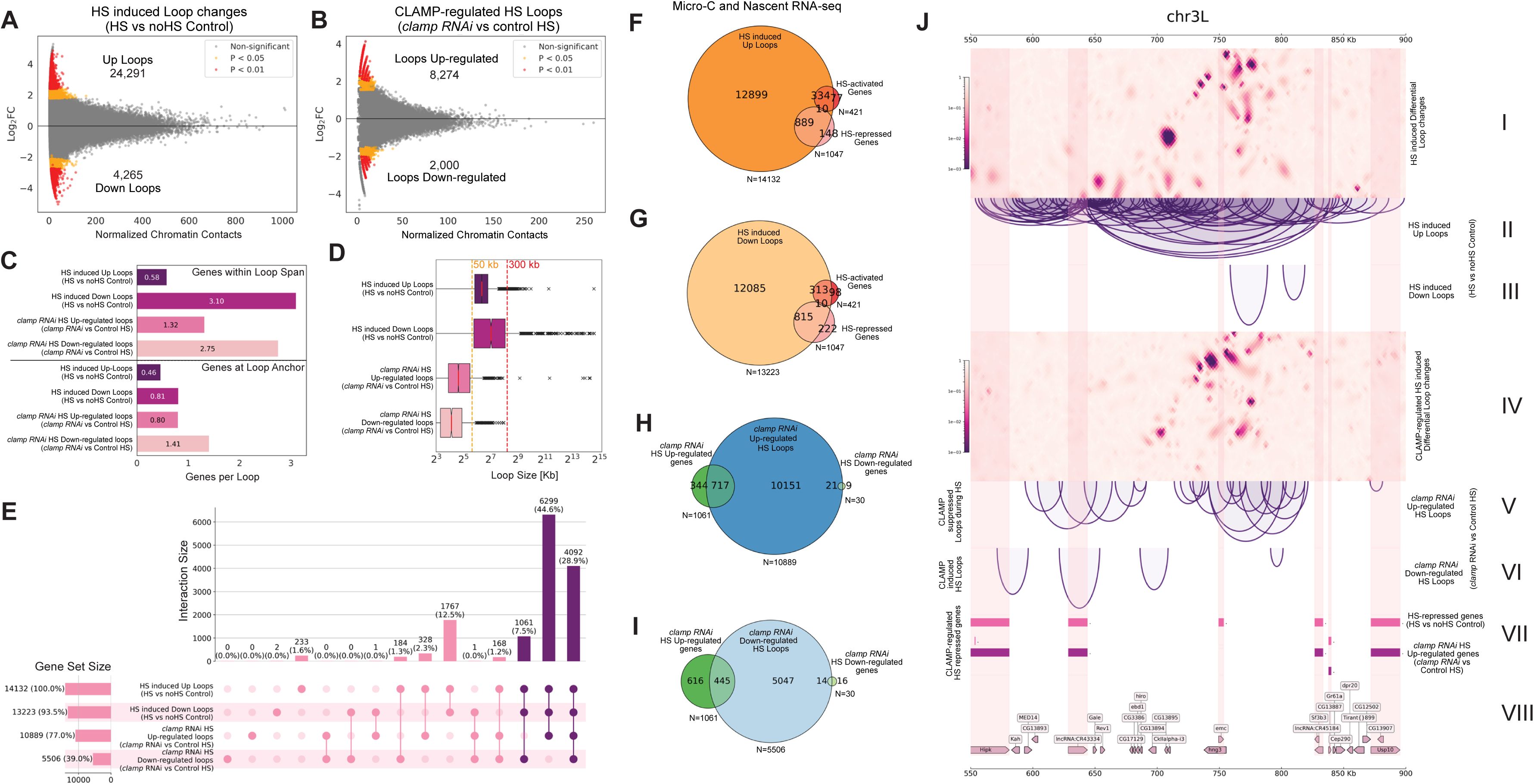 , a well-established model for understanding the mechanisms of HS-induced gene regulation. Using Micro-C, we demonstrate that heat stress induces widespread changes in local 3D chromatin looping, which are significantly associated with HS-induced transcriptional changes. Overall, we identify CLAMP as the first reported TF that induces HS repression, which modulates 3D chromatin looping through both