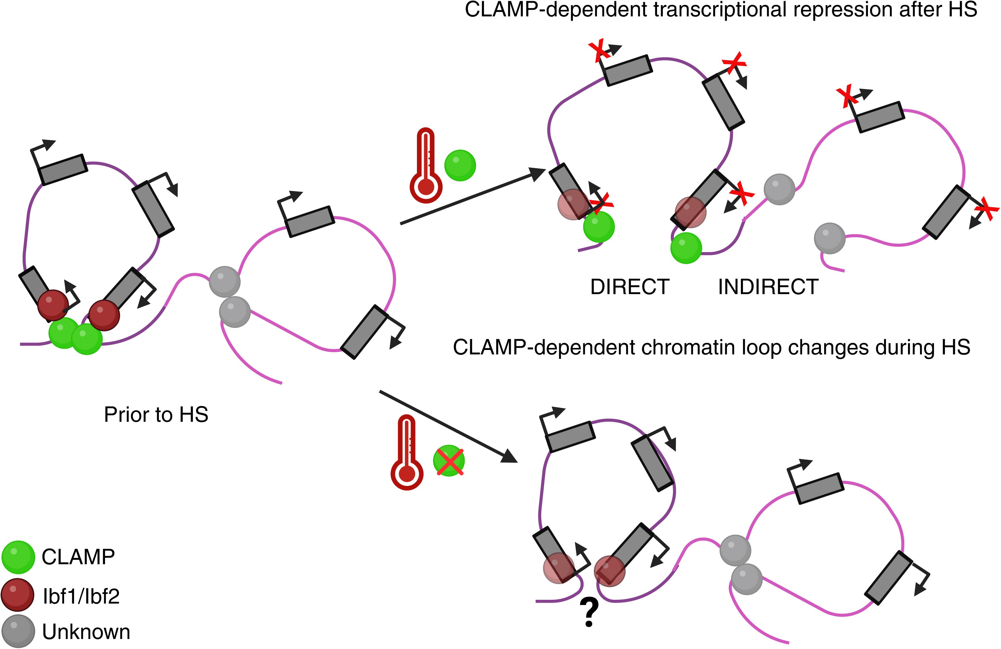regulates HS-induced repression through mediating 3D looping when the following factors are enriched near CLAMP binding sites prior to HS: insulator proteins Ibf1/2, ZIPIC, and the chromatin remodeler ISWI, but not Polycomb. In contrast, CLAMP also
