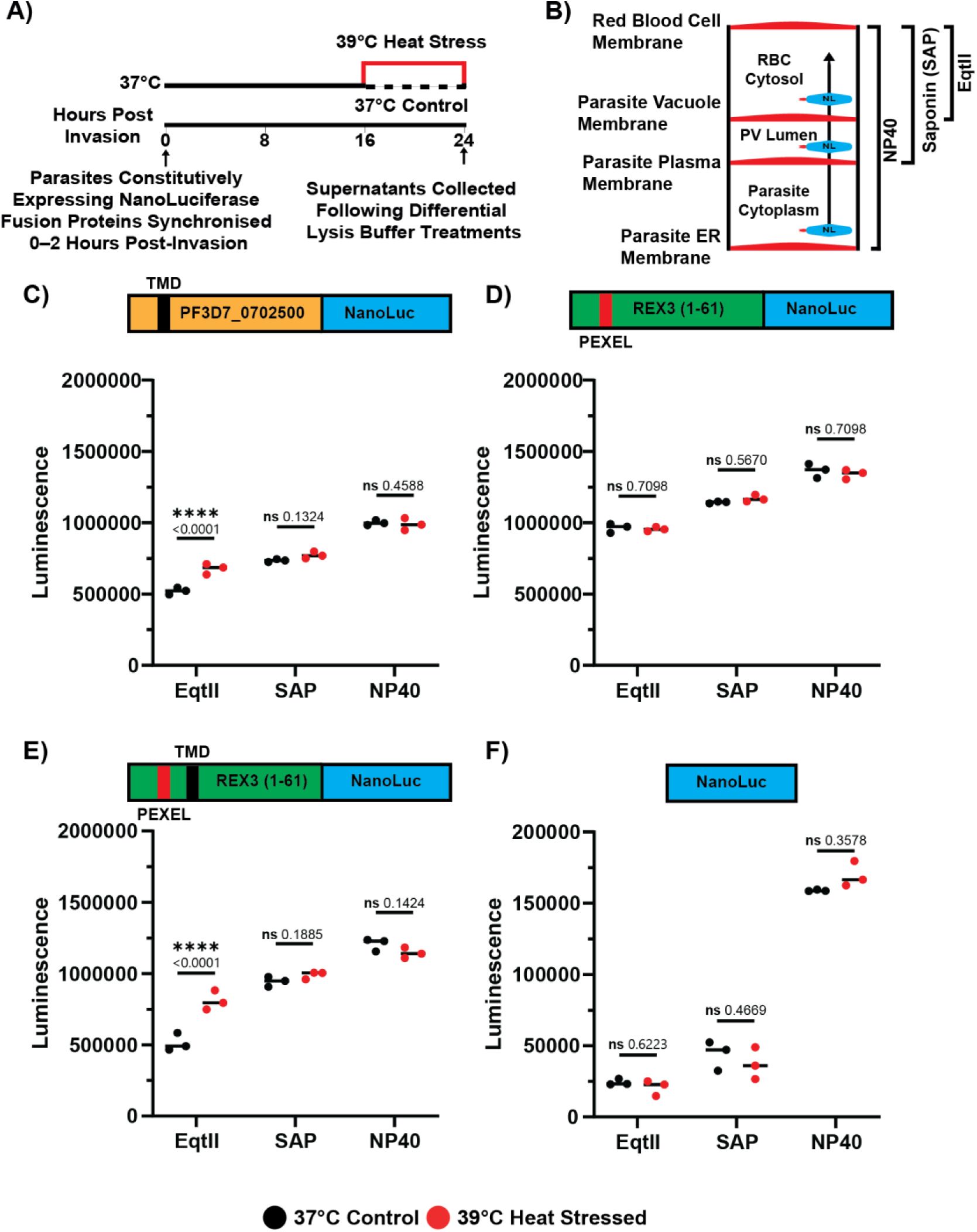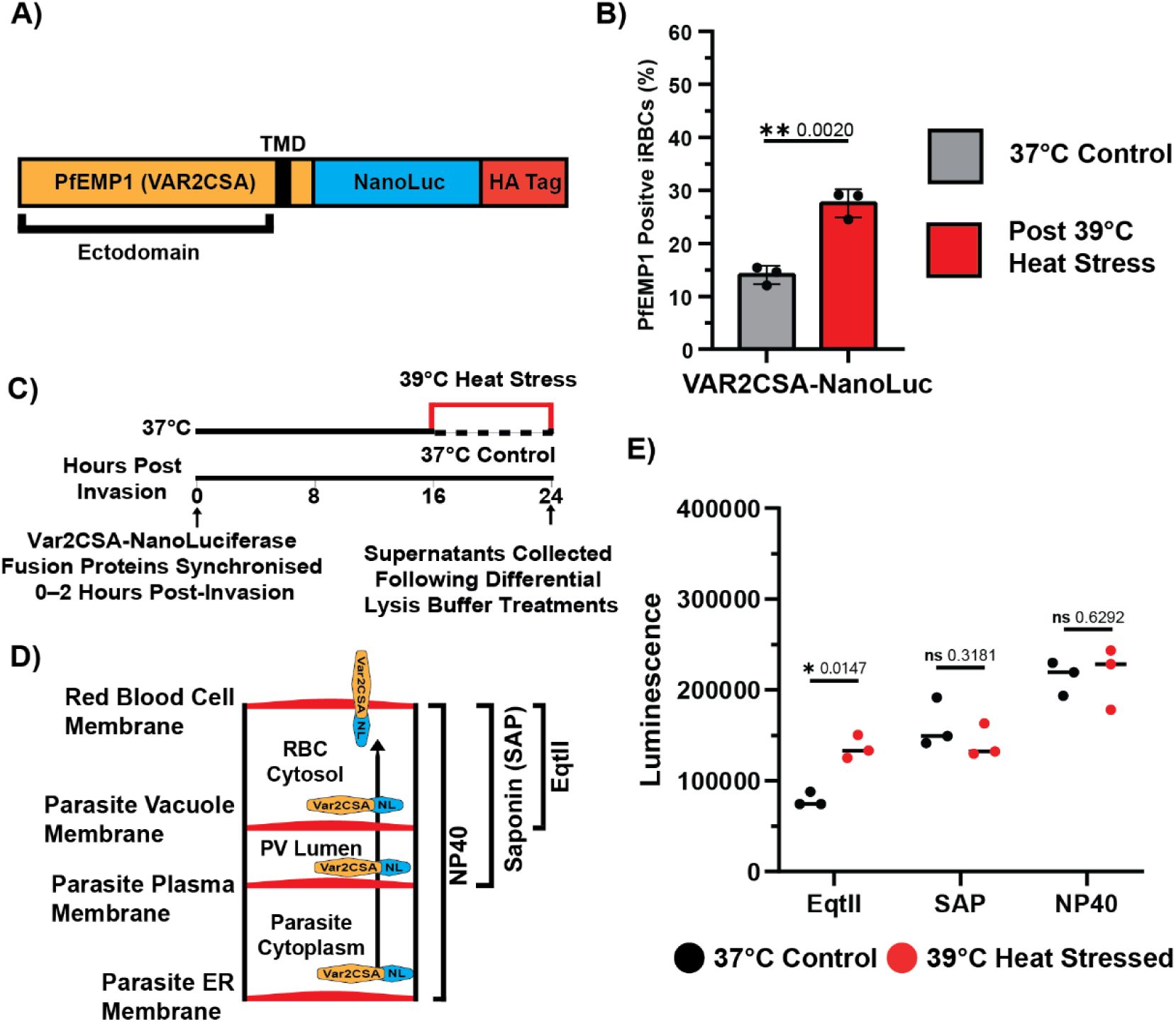 While a variety of temperatures mimicking febrile heat stress have been used in previous studies, these have generally not been assessed in relation to parasite viability, or common febrile temperatures in patients. Therefore, we sought to initially establish conditions that reflect the typical febrile response in malaria patients, focusing on a time window when PfEMP1 is exported and parasite viability remains unaffected.