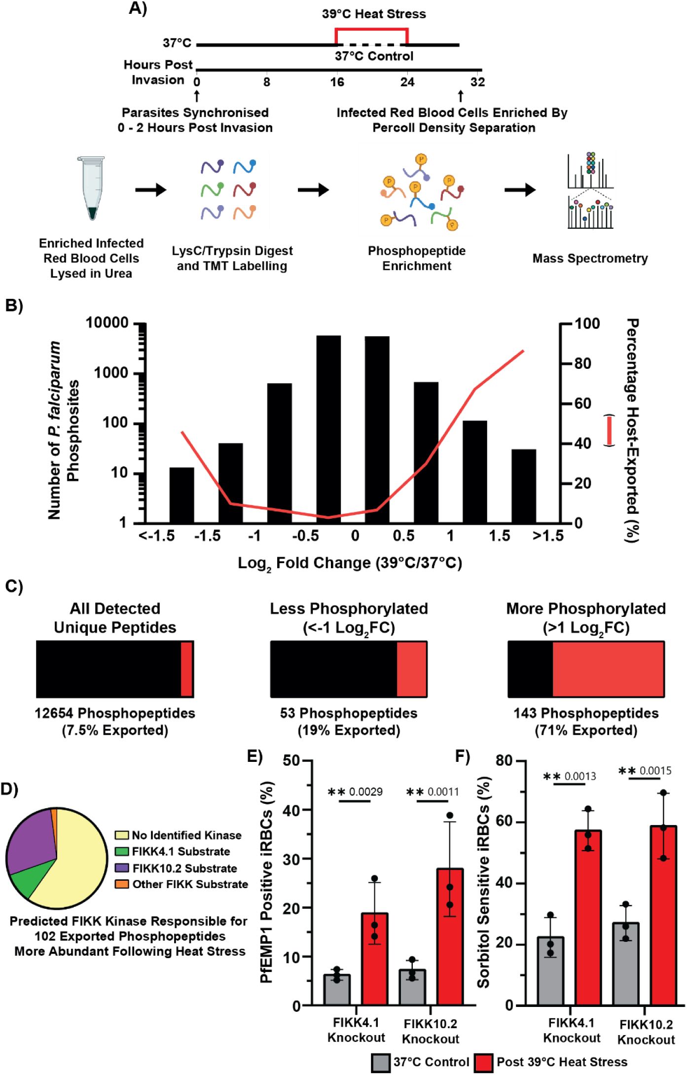 -infected red blood cells (iRBCs) to physiologically relevant febrile heat stress (39 °C), derived from patient data, enhances cytoadhesion through increased trafficking of the major virulence factor PfEMP1 to the iRBC surface. This phenomenon is not limited to PfEMP1 and common laboratory strains, as it extends to the surface nutrient channel PSAC in four clinical isolates of diverse geographic origin. The increased surface protein display occurs without changes in overall protein expression or parasite developmental progression. Using phosphoproteomics and proximity labelling, we find that elevated temperature also increases trafficking and phosphorylation of exported proteins into the RBC. Enhanced export is likely reliant on the presence of a transmembrane domain as shown by NanoLuc reporter assays. Collectively, our results indicate that febrile temperatures commonly experienced during infection can accelerate protein export, likely at the parasitophorous vacuole. This enhanced export following heat stress is relevant because increased cytoadhesion could influence disease severity through earlier iRBC sequestration and elevated bound parasite mass.