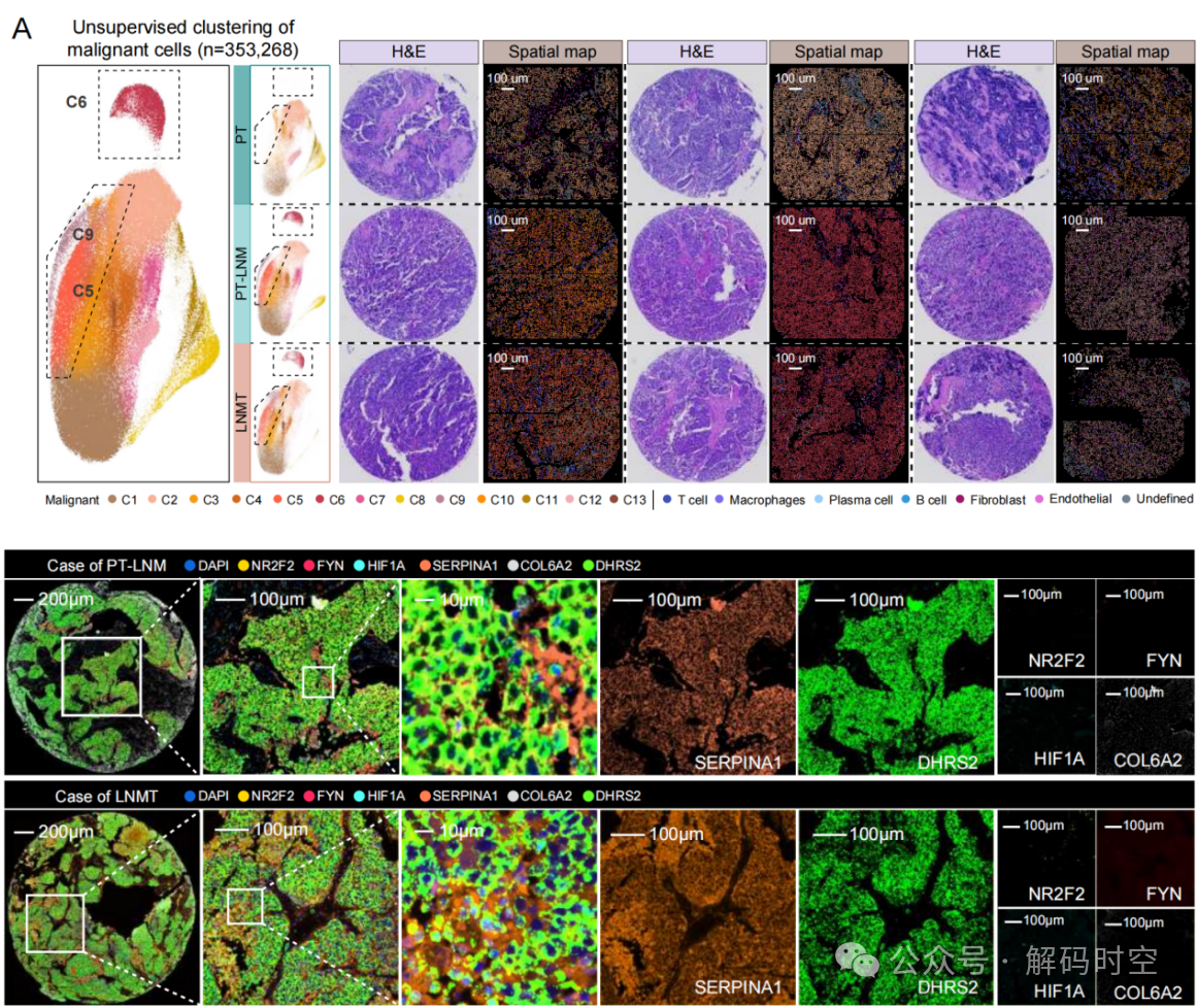 2.mIF验证:验证了CosMx SMI空间转录组得到的细胞空间分布与互作关系,以及淋巴结转移特异性恶性亚群的蛋白水平表达(如FYN+NR2F2+ C5、SERPINA1+DHRS2+ C6)。