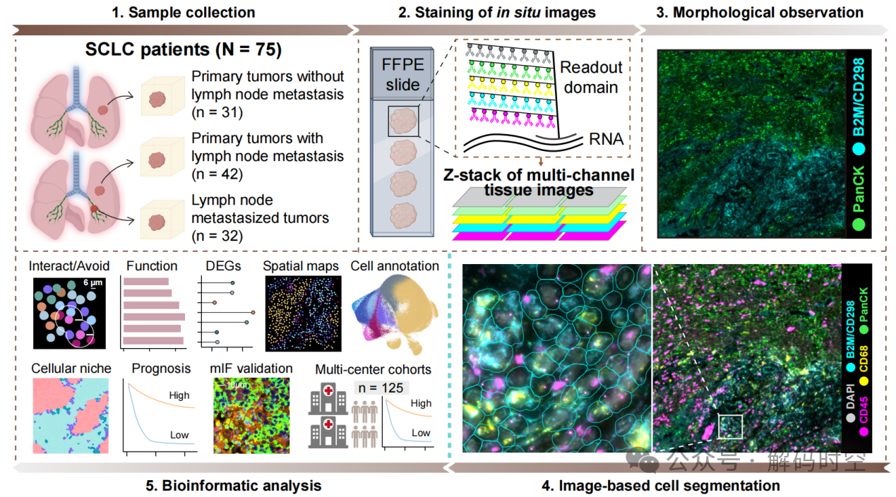 2026年3月30日,温州医科大学生物医学工程学院周猛研究员团队联合中国医学科学院肿瘤医院应建明主任和杨琳主任医师团队,在Cell Reports Medicine 发表题为“Single-cell spatial transcriptomic profiling reveals tumor microenvironment heterogeneity in primary and lymph node-metastatic small cell lung cancer”的研究成果。该研究利用高分辨率的单细胞空间转录组学技术CosMx Spatial Molecular Imager (CosMx SMI),首次系统构建了SCLC原发灶与淋巴结转移灶的高分辨率空间细胞图谱,从空间维度揭示了SCLC在淋巴结转移过程中肿瘤微环境的异质性演化、细胞互作重塑及其潜在临床意义。本研究中的单细胞空间转录组CosMx SMI 检测工作,由解码生物时空组学技术团队完成,其精准、高效的技术支持为研究结论的验证与机制解析提供了坚实的数据保障。