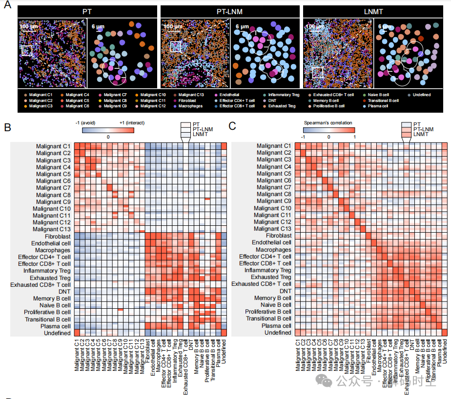 2.鉴定出淋巴结特异性的恶性细胞亚群(C5/C6/C9),揭示了转移过程中血管-免疫 niche的动态重编程及恶性亚群的局部空间免疫排斥机制;
