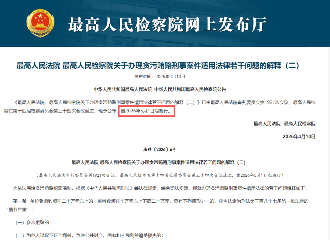 2026年4月10日,"两高"联合发布《关于办理贪污贿赂刑事案件适用法律若干问题的解释(二)》,自2026年5月1日起施行。该解释特别强调,在食品药品、医疗等领域行贿,属于从重处罚情节。同时,明确了单位行贿罪的定罪量刑标准,单位行贿数额在40万元以上的,即可追究刑事责任。