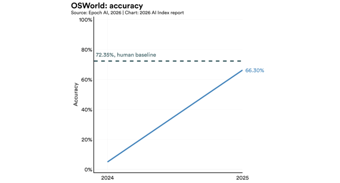 AI 能力存在明显的“锯齿状前沿”——在某些复杂任务上表现出色,却在简单任务上失败。例如,谷歌的 Gemini Deep Think 模型能在国际数学奥林匹克竞赛中获得金牌,但顶级模型读取模拟时钟的正确率仅为 50.1%。AI 智能体(AI Agent)在真实计算机任务上的成功率从 12% 跃升至 66%,但在结构化基准测试中仍有约三分之一会失败。