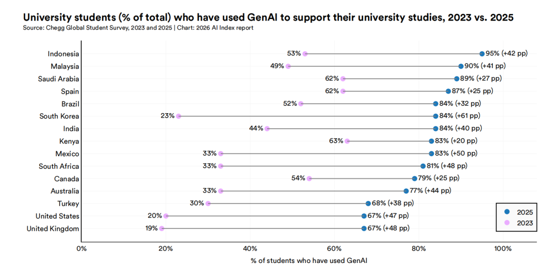 超过 80% 的美国高中生和大学生使用 AI 完成学业,但只有一半的初高中制定了 AI 政策,仅 6% 的教师认为这些政策清晰明确。学生们最常使用生成式 AI 进行研究、论文编辑和头脑风暴。在课堂之外,阿联酋、智利和南非的 AI 工程技能增长最快。