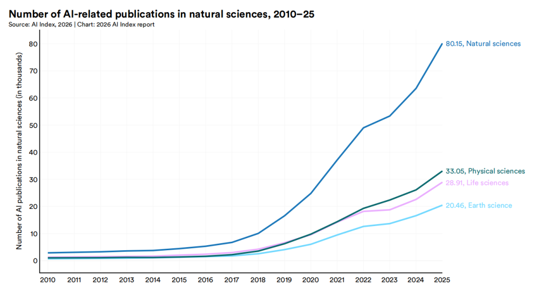 AI 相关的研究论文逐年递增。2025 年,自然科学领域的 AI 相关论文多达 80150 篇,较 2024 年增长 26%。如今,AI 在科研成果中的占比因学科不同而有所差异,在 5.8% 至 8.8% 之间,而 2010 年这一比例还不到 1%。