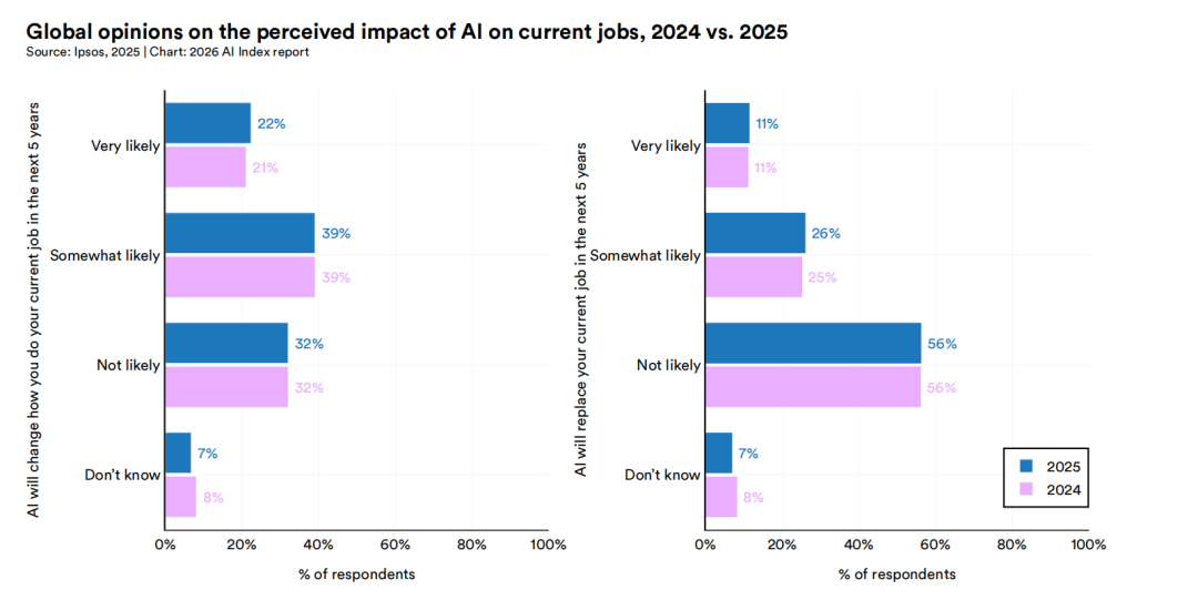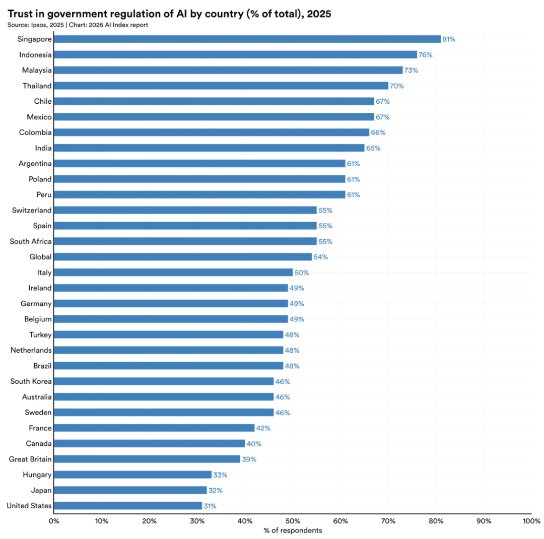 AI 专家与公众对技术未来的看法存在巨大分歧:73% 的专家预计 AI 对工作方式有积极影响,而公众只有 23% 持相同看法。在经济和医疗影响上也存在类似差距。全球对 AI 监管机构的信任度参差不齐:在接受调查的国家中,美国公众对本国政府监管 AI 的信任度最低,仅为 31%。全球范围内,欧盟在有效监管 AI 方面获得的信任度高于美国或中国。