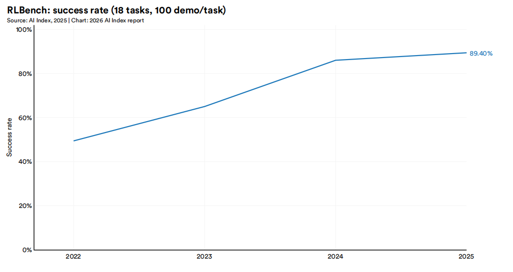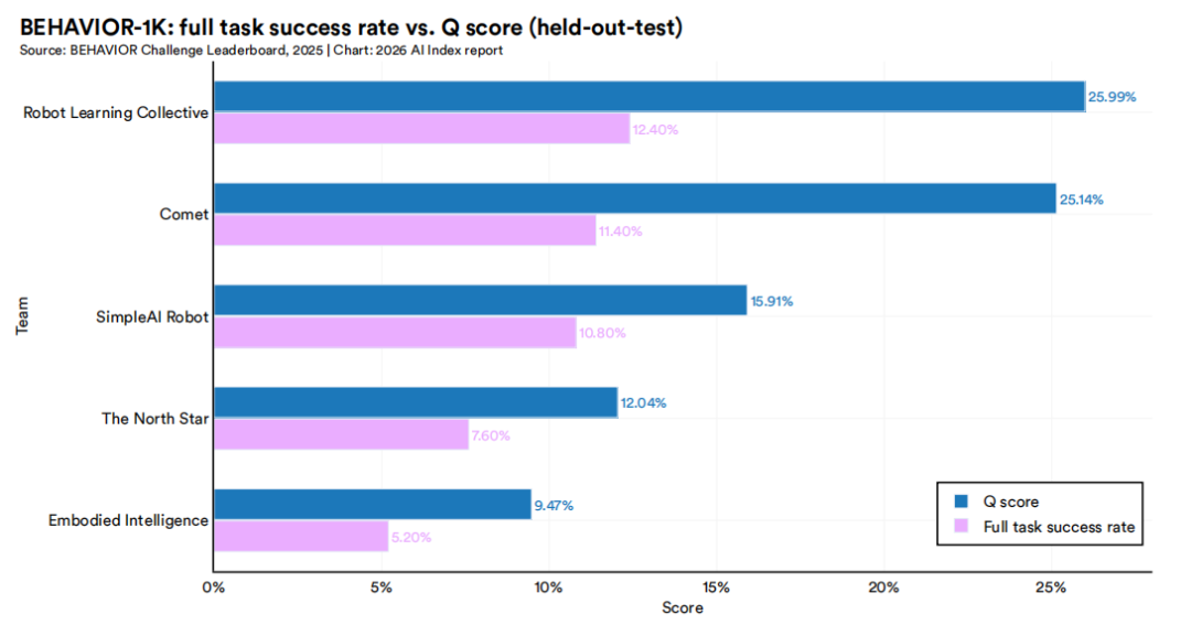 AI 机器人在受控实验室环境中表现出色,软件模拟的机械操作成功率已达 89.4%。但在真实家庭环境中,AI 机器人仅能完成 12% 的任务,凸显了 AI 在物理世界中的巨大挑战。