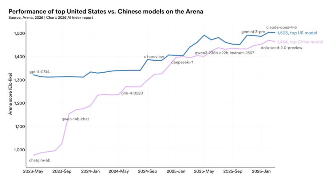 中国和美国在 AI 模型性能上的差距已基本消失。自 2025 年初以来,中美两国的 AI 模型多次交替领先。截至 2026 年 3 月,美国顶级 AI 模型仅领先 2.7%。不同之处在于,美国在顶级 AI 模型的数量和高质量专利上仍占优势,而中国在 AI 相关论文数量、引用量、专利总量和工业机器人安装量上领先。
