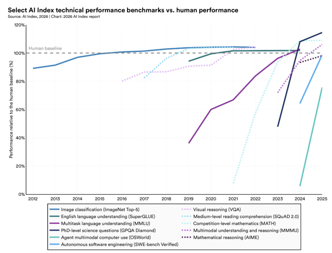 报告显示,AI 的发展没有放缓,反而在加速普及。2025 年,超过 90% 的前沿 AI 模型来自企业,而非学术界。这些模型在博士级科学问题、多模态推理和数学竞赛中已达到或超越人类水平。在编程基准测试 SWE-bench 上,AI 性能在一年内从 60% 跃升至接近 100% 的人类基准。