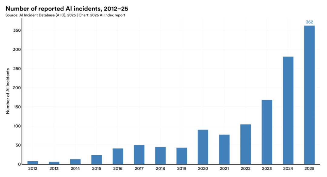 随着 AI 能力提升,安全问题日益突出。几乎所有前沿 AI 开发商都会报告性能基准,但负责任 AI 的评估报告却零零散散。AI 安全事故从 2024 年的 233 起激增至 2025 年的 362 起。更棘手的是,研究发现,提升 AI 的安全性可能会降低其准确性,形成“此消彼长”的困境。