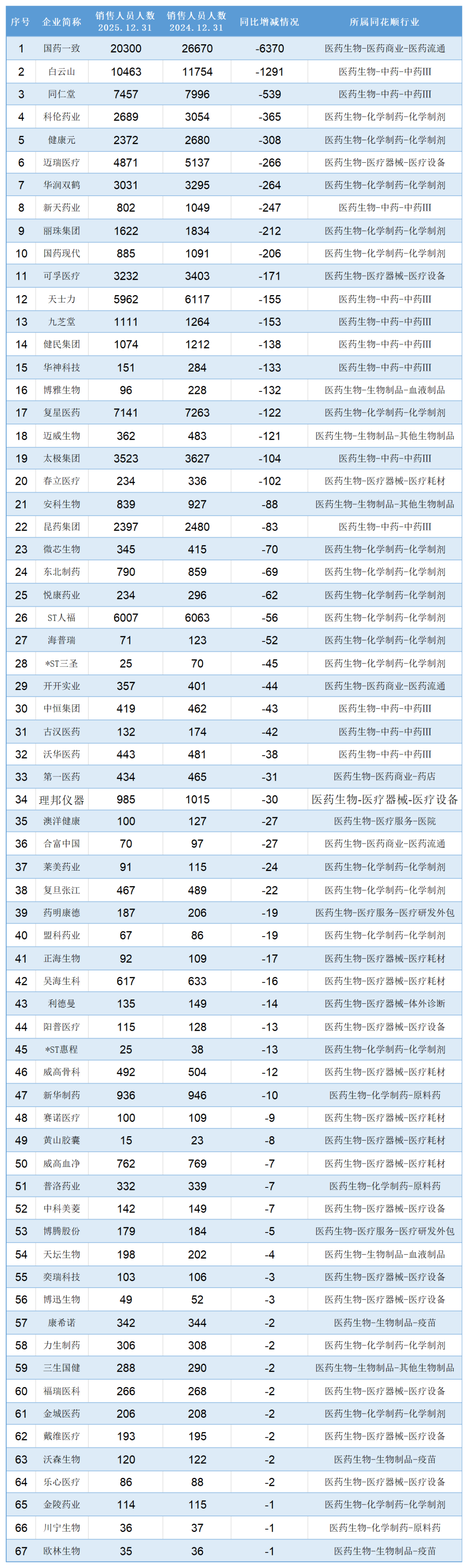 在67家销售人员减少的企业中,减员幅度从个位数到上千不等,覆盖医药流通、中药、化学制剂、医疗器械、生物制品等多个细分领域。其中,国药一致减少6370人、白云山减少1291人、同仁堂减少539人,分列前三。