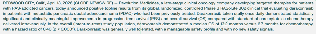 2026年4月13日,Revolution公布其胰腺癌药物Daraxonrasib(RMC-6236)的III期临床试验积极结果:患者中位生存期延长近一倍。受此消息影响,Revolution股价大涨超过40%,市值跃升至270亿美元。市场预计,Daraxonrasib的峰值销售额有望达到约120亿美元。